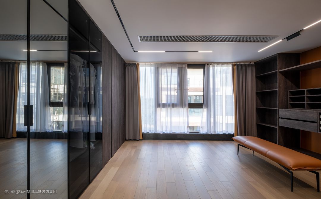 衣帽间采用木质实体柜不同大小格局,能够安排放置不同大小的物品,黑色的柜体镶切在墙体,美观实用的同时觉得颜值满分,橙色的沙发带来舒适惬意之感。想象着在这样的舒适大气的空间里装扮好自己的衣服,点亮出自己一天的心情,相信美美的自己运气也会爆棚的哦!