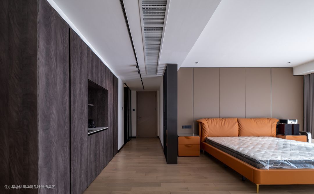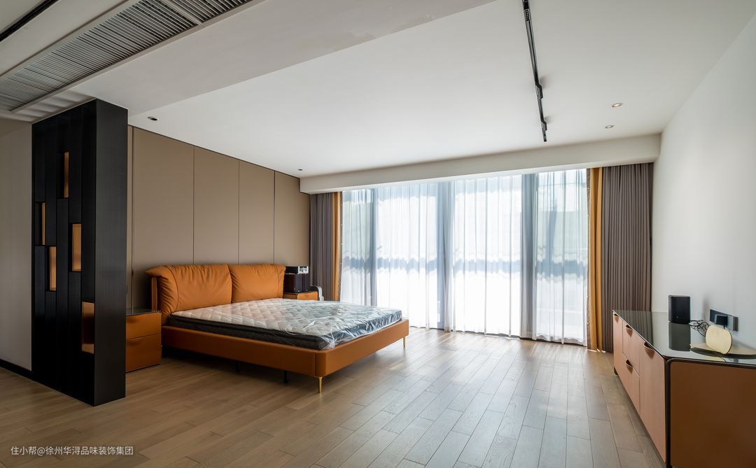 主卧的空间空旷,采用原木色的地板打造出温馨的之感,以黑色木质格木隔断设计打造静谧休闲区与功能区,电视柜锲入墙体内,隐形的衣柜储物柜既美观储藏空间也大,灰色与橙色的窗帘形成视觉遮挡,卧室采用了极简的格调,打造属于心灵休憩休息的最佳场所。