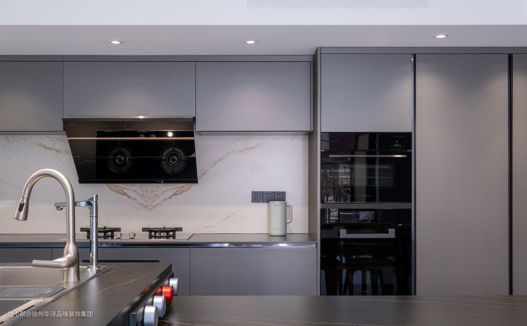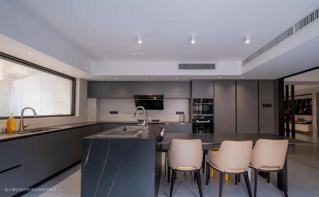厨房采用居中定制岛台+餐桌的格局布置,回字形动线让家人日常行动更加方便。大餐桌与岛台相连的配置也便于家宴的布置,以及待客会友。