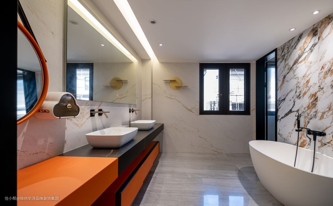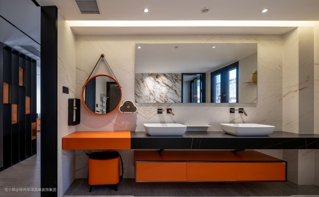 公区卫生间的设计整体以明亮的白色与橙红色搭配为主,明亮的镜子,白色的洗漱盆、橙色的镜面以及一整排的储物柜的设计,既简单又特别,精致的墙面圆盘非常好看,设计得层次感鲜明,非常敞亮的感觉。