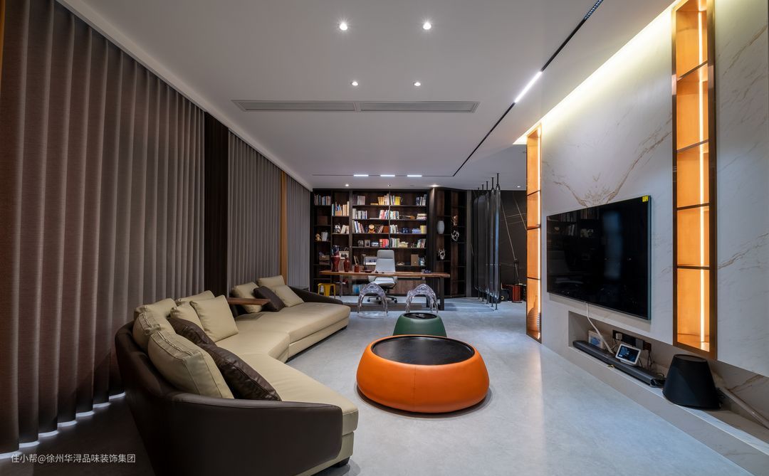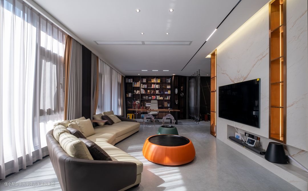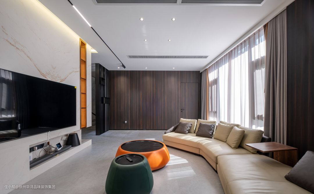 在客厅上,本案抛弃原有的奢华风格,选用简单、明净、自然的现代极简风格,将纯粹融入空间,与自然共生,做到见之如“空”,打造成明快放松的休闲居所,橙色的茶几点缀明亮色彩,亦可当桌子亦可当凳子,沙发上一个面板的设计可放置小物品,实用美观。