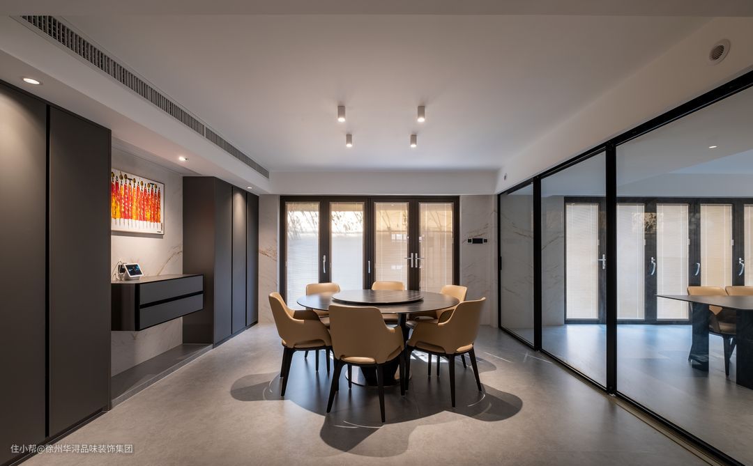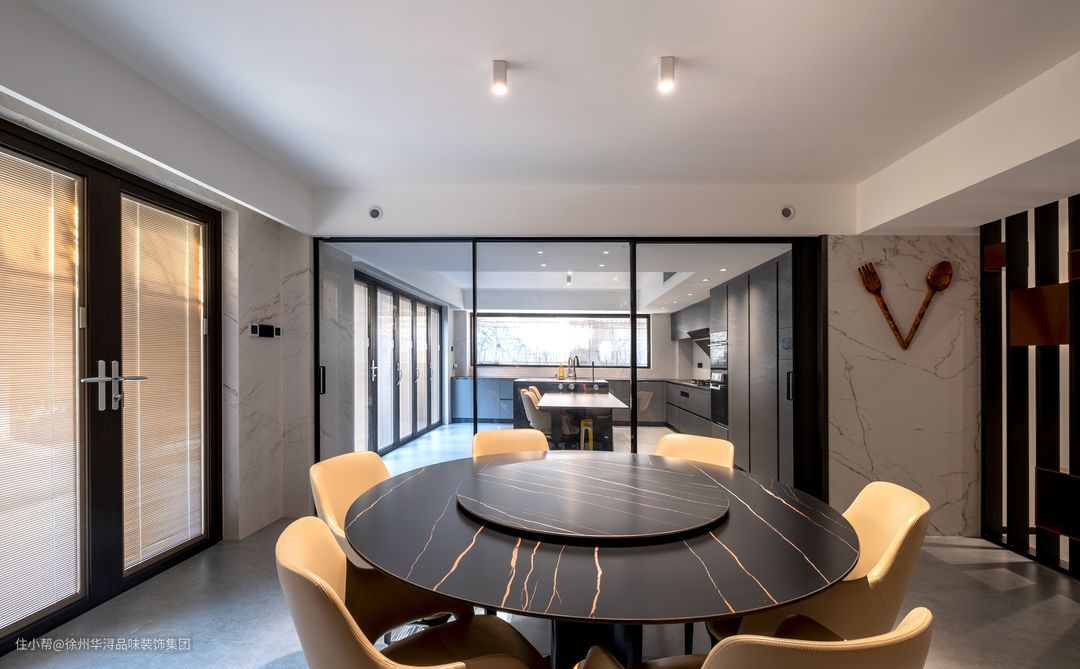 餐厅与厨房用推拉门设计,打开可以使得空间更空旷,关闭则可以打造厨房隐秘空间,非常利用空间,打造创意的空间,仿佛用餐的心情也会如鸟儿般雀跃起来。