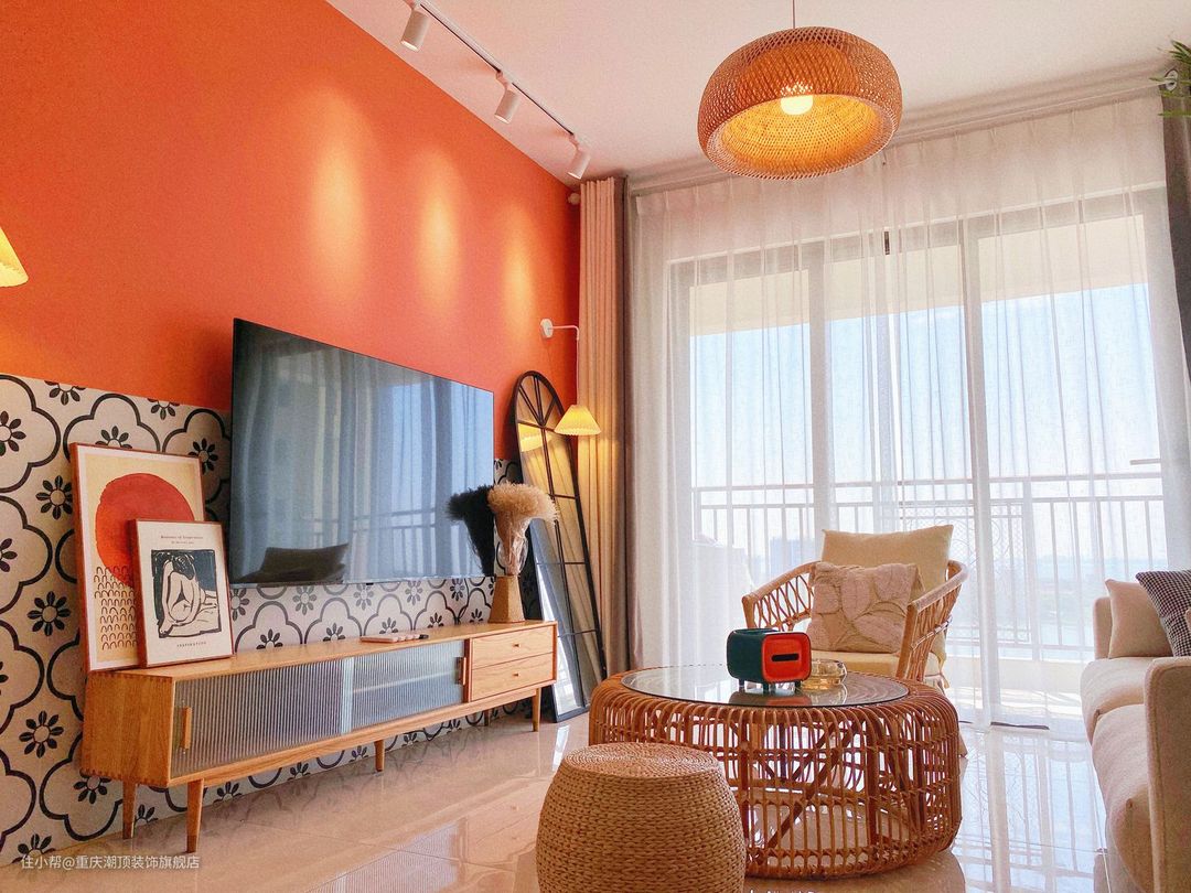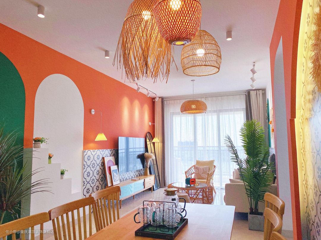 在配色上客厅运用大面积橙色作为背景搭配原木系家具,而植物是大自然的馈赠。 在家具材料的选择上,南洋风格主要就地取材,用天然的木、藤、竹、石勾勒出一个极具海岛风情的静谧空间。