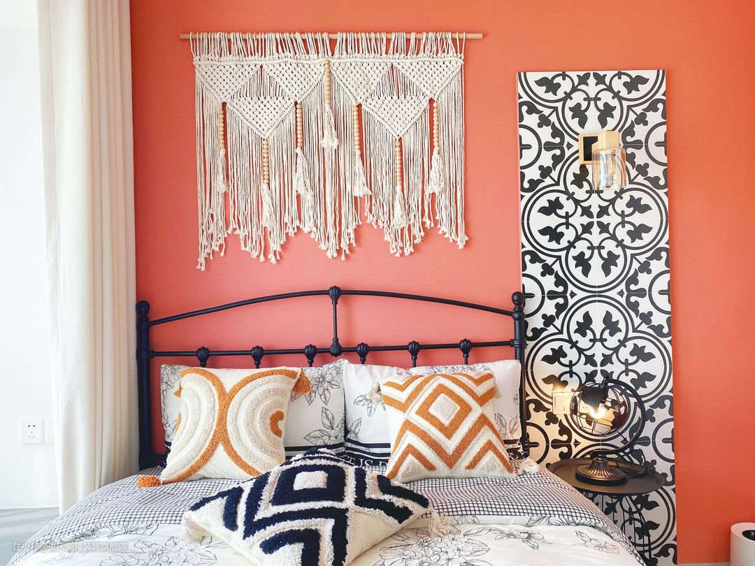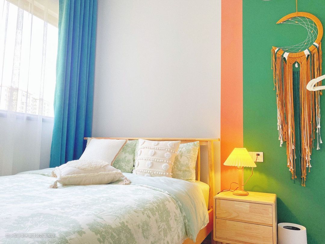 次卧的颜色选择稍微低饱和的橙色,在四件套的搭配上以波西米亚风白色黑色为主,适合老人长期居住。 考虑到老年人睡眠浅的问题,房门采用桥接电源板材料,隔音效果更好。 儿童房的色彩搭配相对于来说活跃一些,绿橙色的色彩搭配,延续客厅主色彩为主搭配蓝色窗帘,与清新的碎花四件套做出层次感
