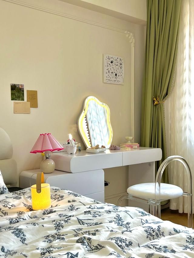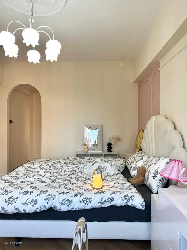 主卧的主色调与客餐厅的主色调一致,背景墙添加了三分之一的浅粉色乳胶漆,为室内增添了俏皮活泼的氛围。