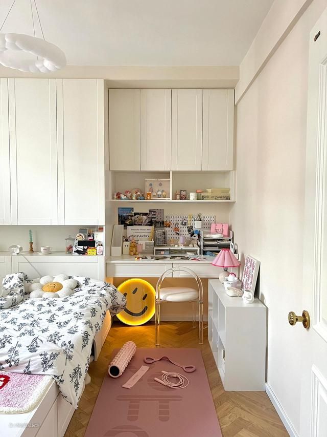 书桌和书柜紧挨着床,走廊大约1米宽,足以放一张瑜伽垫。通常,女主人在这里锻炼。