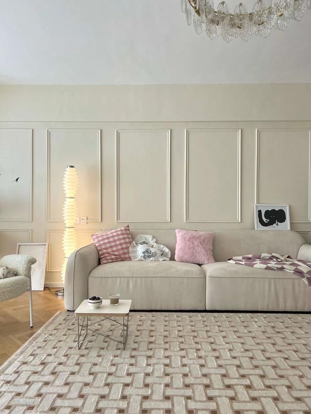 经典的法式石膏线背景墙是用带有平面线的矩形框架建造的。简约时尚的效果可以增强客厅空间的层次感和立体感。