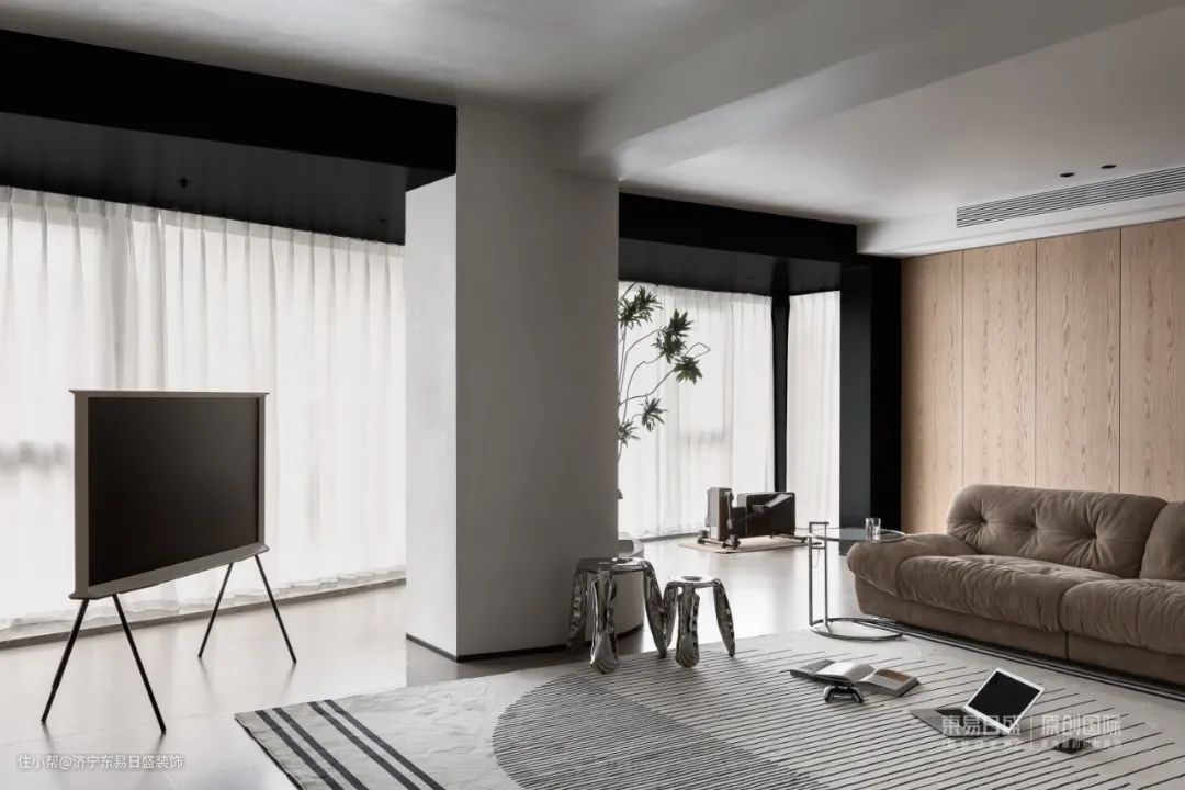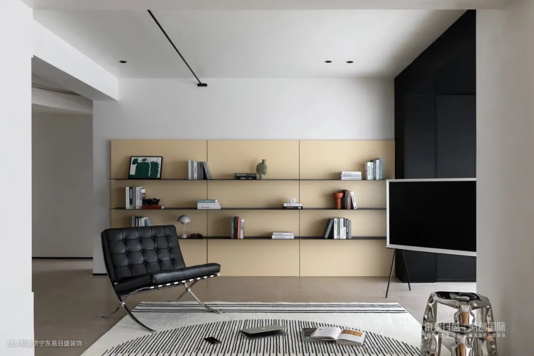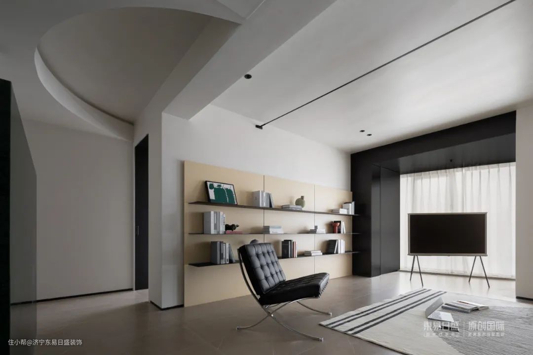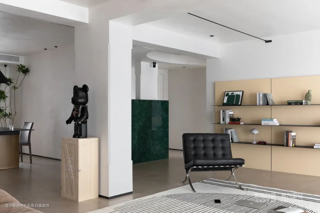 公共空间彻底打开,不靠墙的落地沙发,全开放的层板架,在独立之间架设连接的大块地毯,铺陈出家的松弛感。