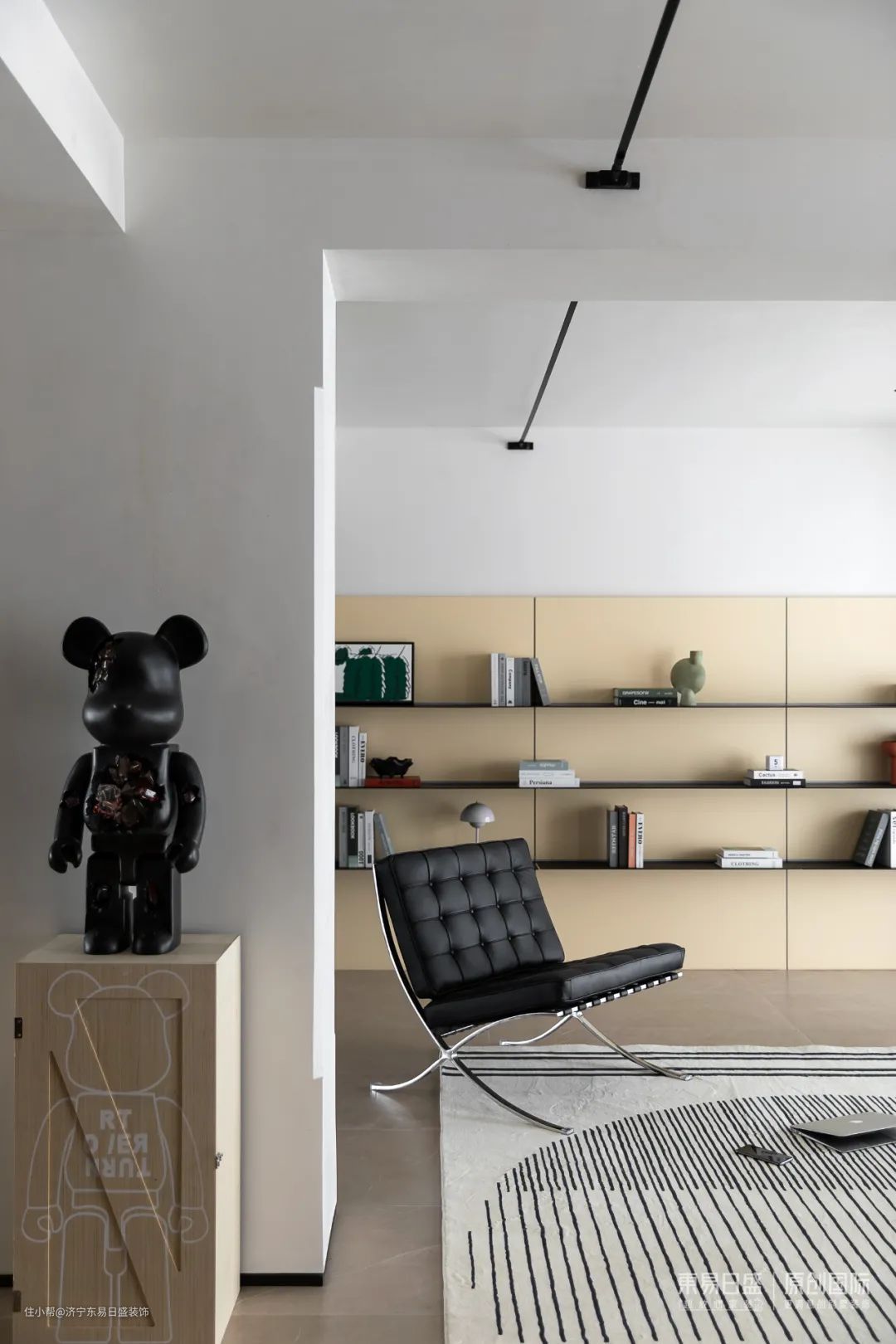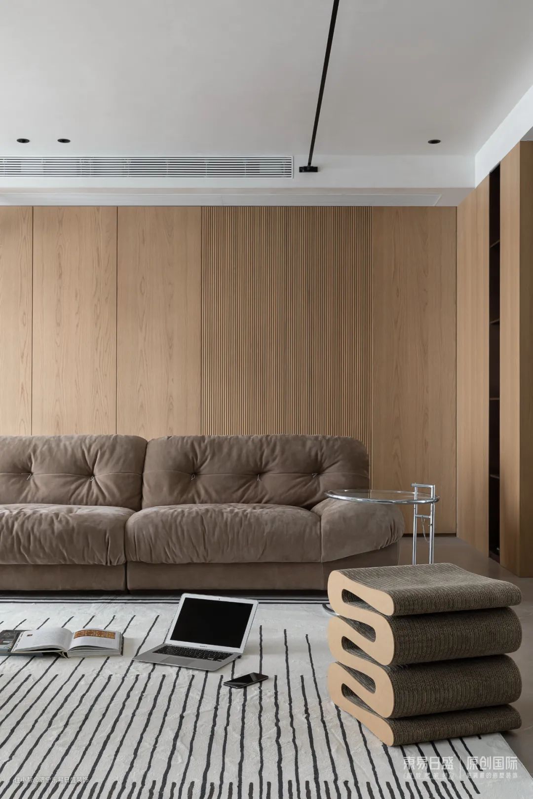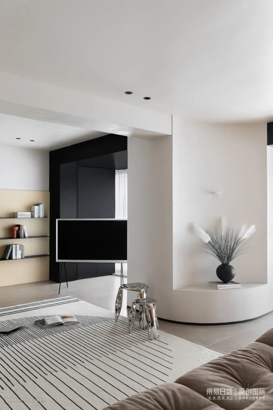公共空间彻底打开,不靠墙的落地沙发,全开放的层板架,在独立之间架设连接的大块地毯,铺陈出家的松弛感。
