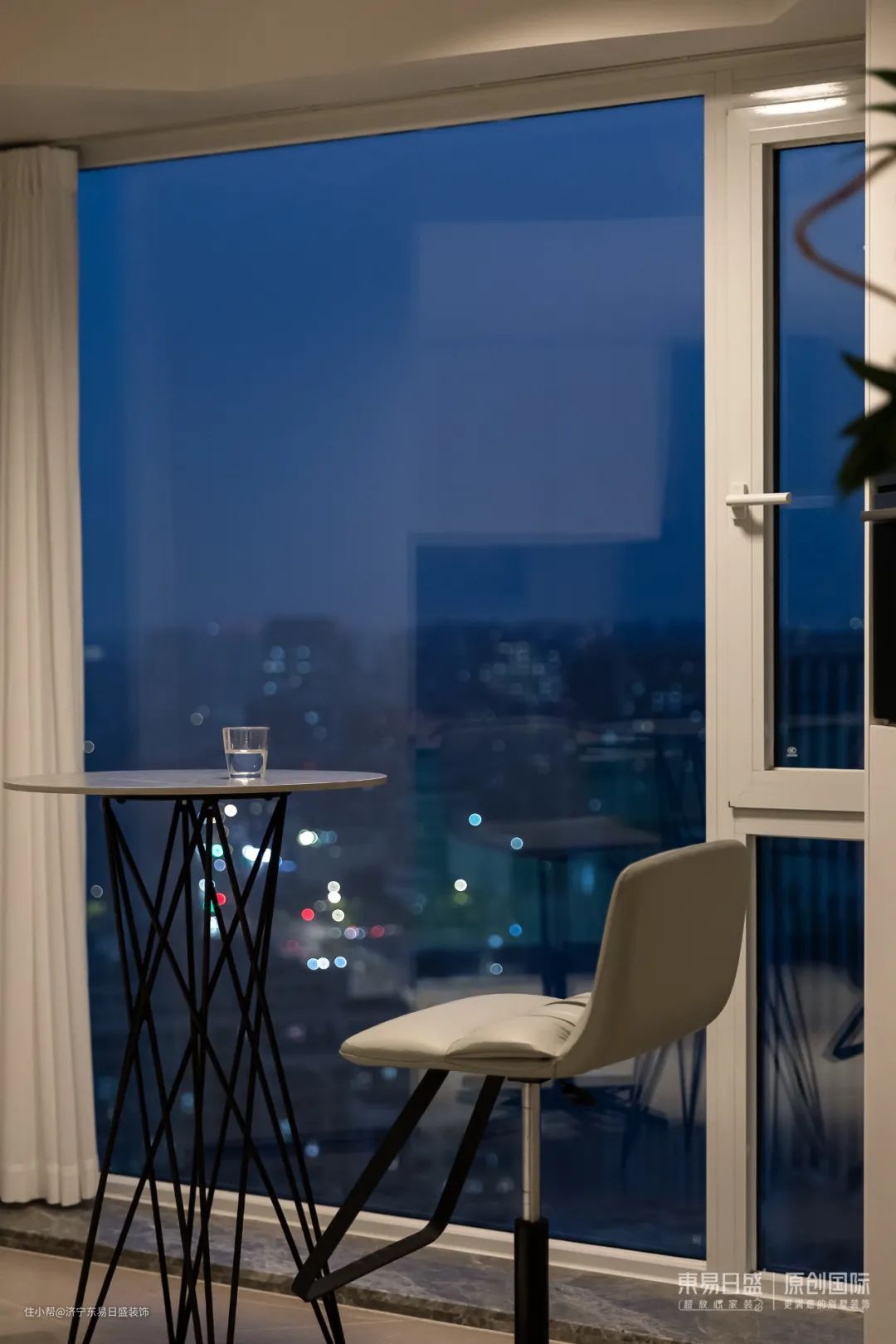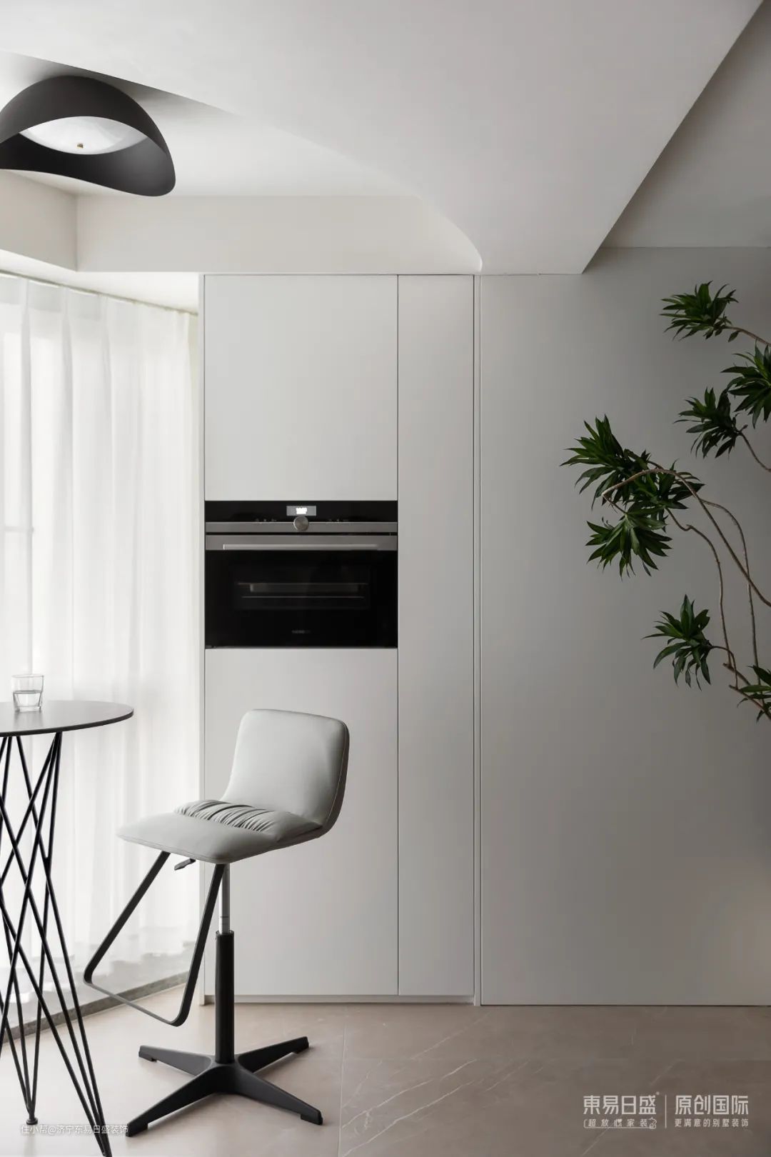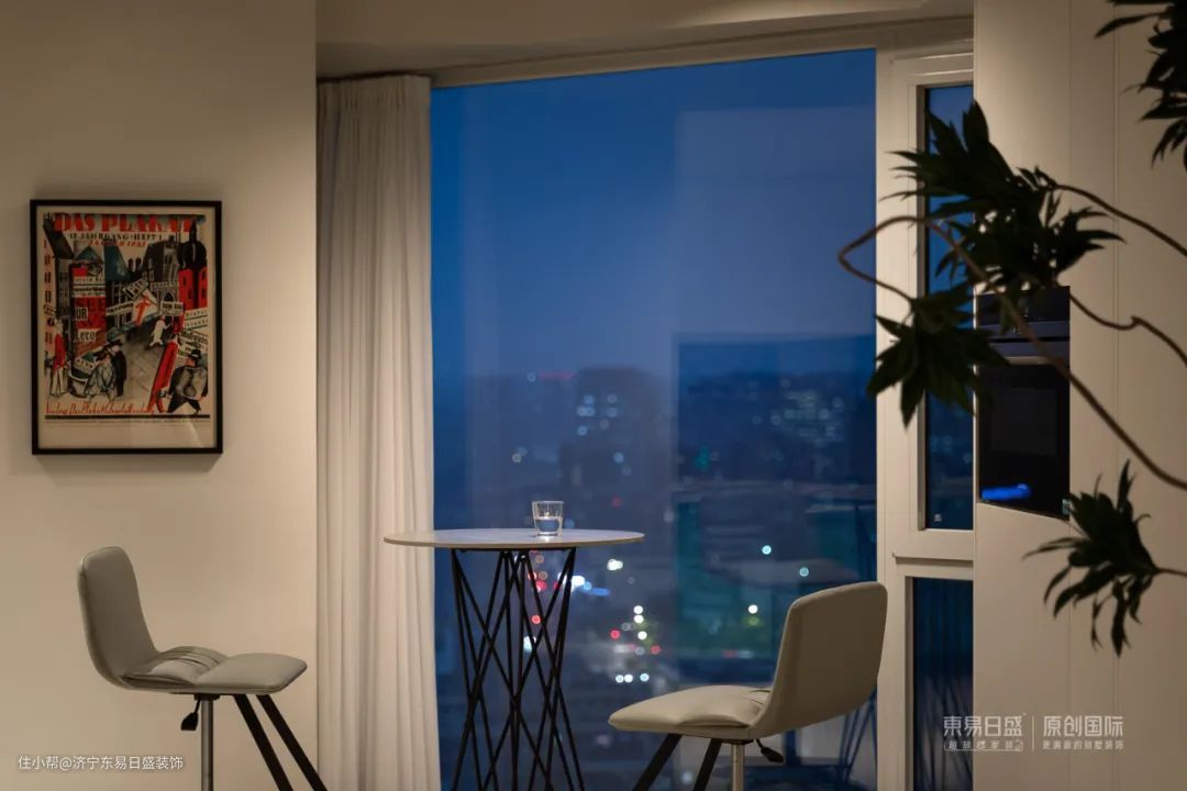 餐厅角落的小弧度空间暗藏“惊喜”,活泼空间的同时又呼应了空间中的「建构」之美,开放式餐厨设计,餐桌,圆岛台,落地玻璃,以及远处的霓虹灯,勾勒出都是生活的剪影。