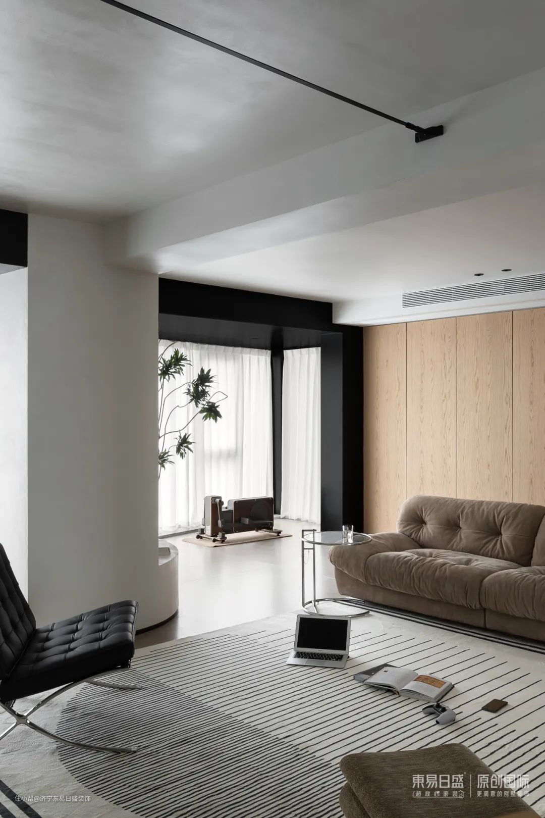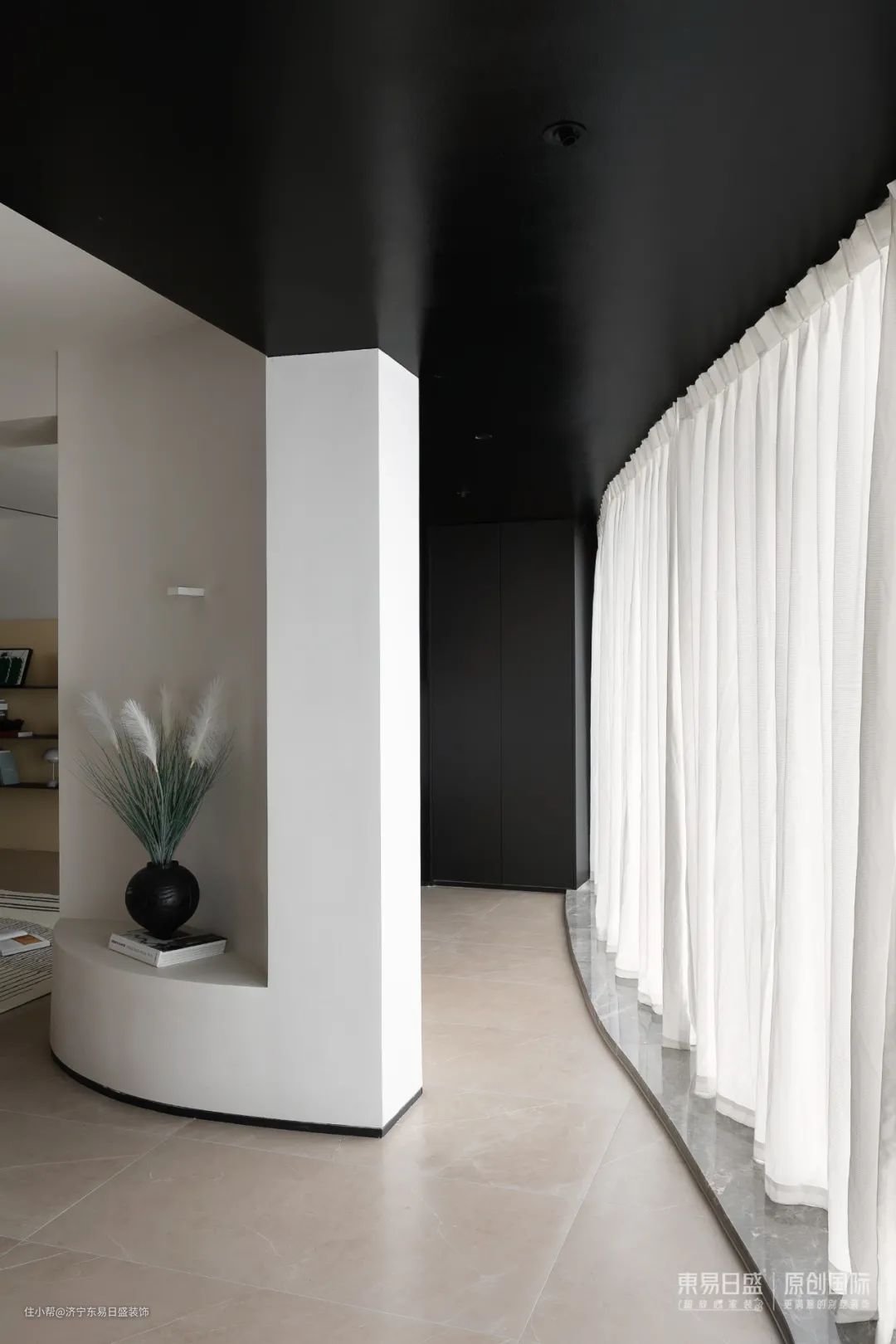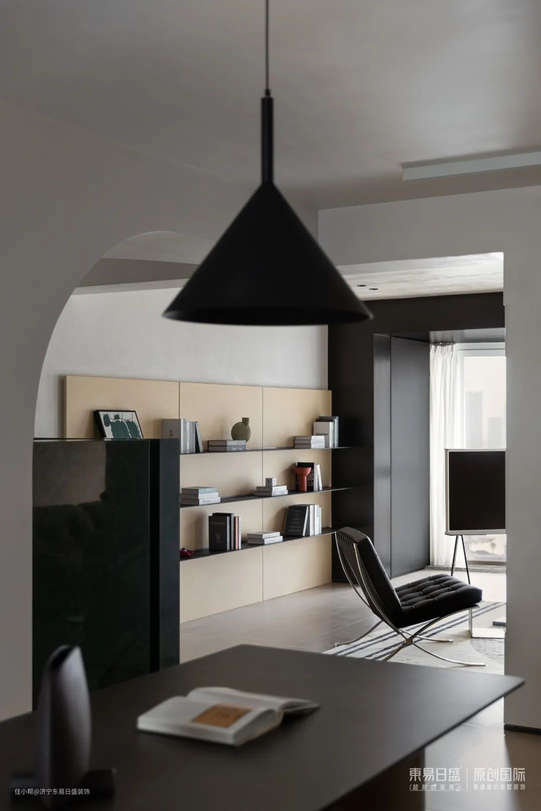 阳台在开放中寻求独立,纯黑的的吊顶和柜门,犹如画框一样定格了”钱塘江景”。大胆的色彩对比界分了空间,形成一个独立的健身和观景休闲的角落,「角落」形成自然而然。