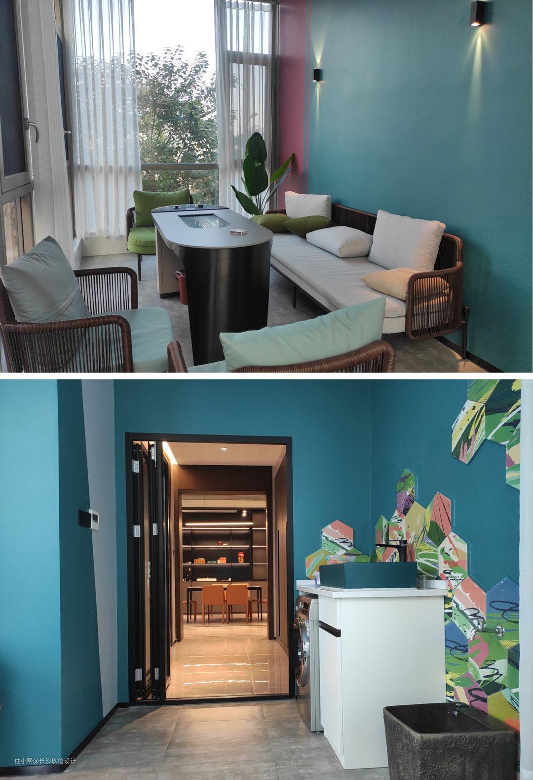 此处的洗衣机柜区域看上去也是充满着艺术,打破了常规的瓷砖上墙防水,采用这种小众化的瓷砖既美观又解决了潮湿的问题