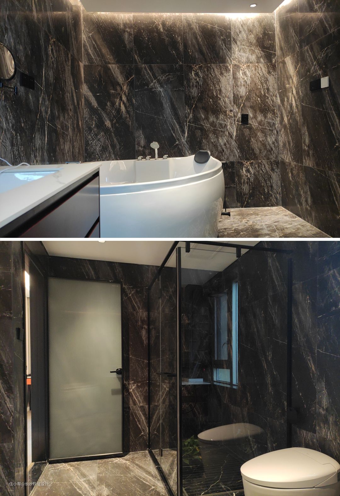 主卫拥有一个大浴缸是多少人的向往,深色墙砖夸张的纹路视觉冲击力很棒