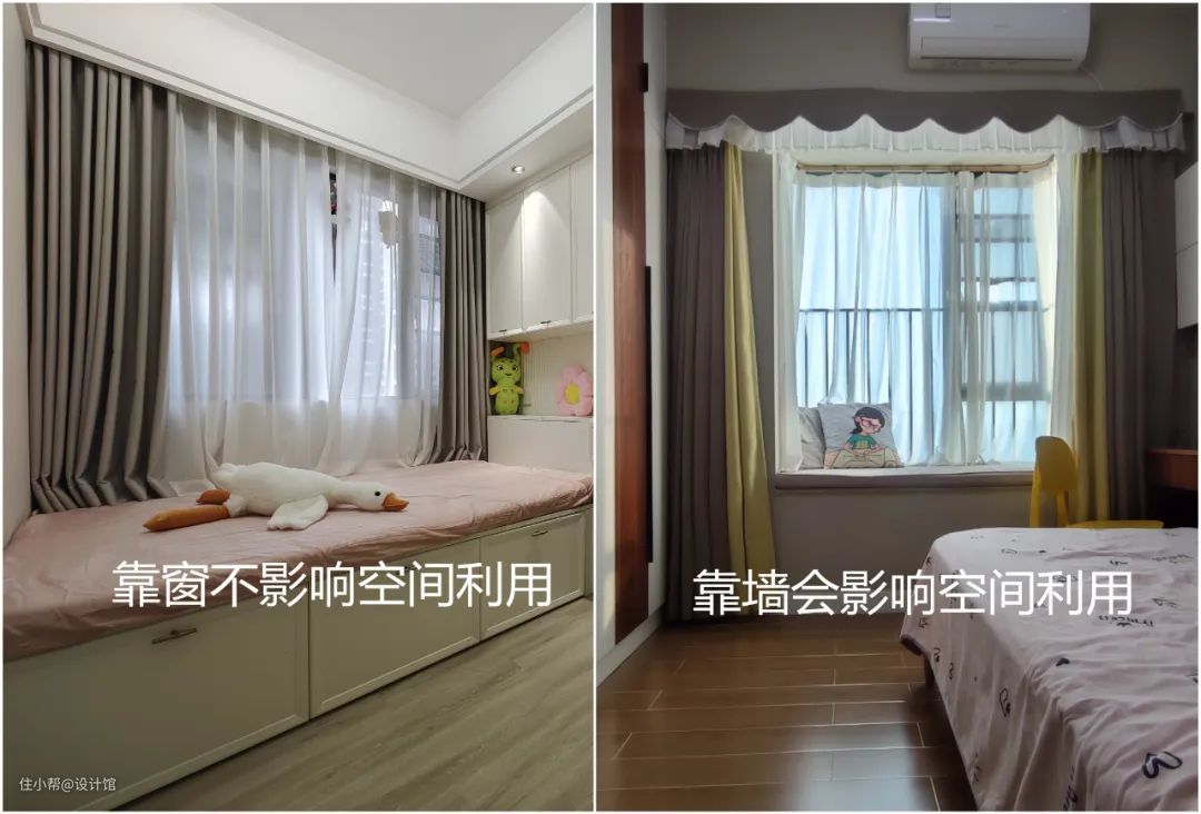 现在开发商的户型,卧室的窗户基本都是飘窗结构的,飘窗与普通窗户的结构不同,窗帘安装会有不同的方式——可以靠窗或靠墙,靠窗安装窗帘,窗帘就不会影响到飘窗以外的区域,但会有漏光的情况;靠墙安装窗帘,遮光效果更好,但是飘窗两侧的空间利用会被窗帘影响。