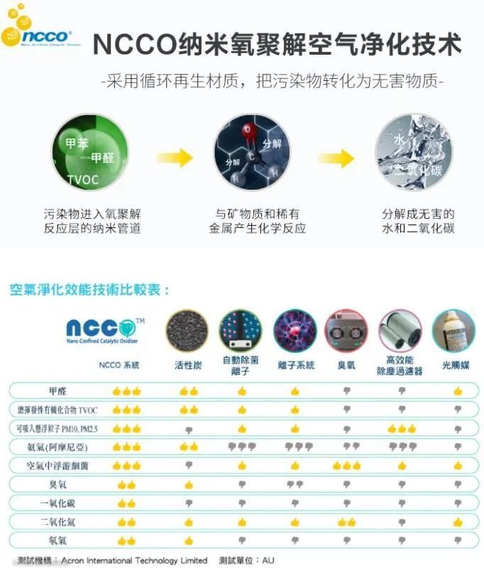 而活氧发生器同步释放微量活氧破坏细菌、病菌微生物的结构,使他们彻底失活,达到99.99%的除菌率,净化彻底全面。无残留的净化方式也让NCCO滤芯不易饱和、不易受损耗,能长期使用6年以上不用更换,大大减少了滤芯更换成本。
