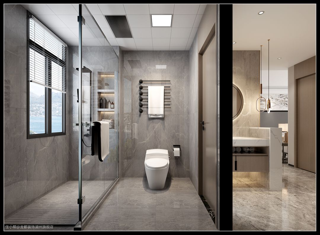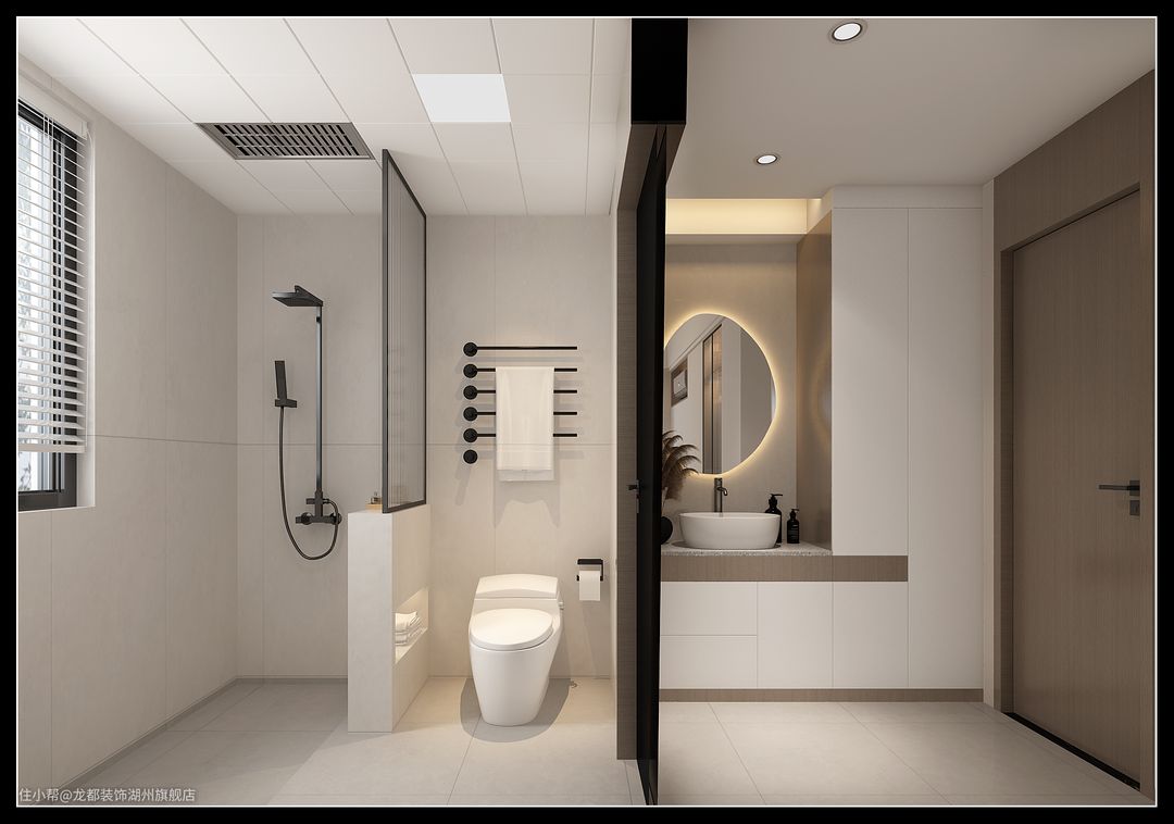 两个卫生间设计皆使用了洗手台外移的设计,主卫马桶区与淋浴区做了玻璃隔断干湿分离。次卫则是半隔断设计,解决了小空间视觉容易产生的压抑之感。整体空间利用简约的线条与利落的造型,塑造出现代时尚的空间,简约舒缓。