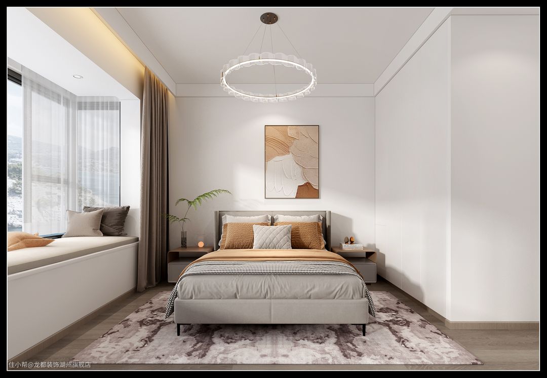 次卧大面积白色+暖驼色点缀,奠定了自然静谧的卧室氛围,飘窗简单的加上垫子,可以躺在上面俯瞰窗外的美景,静静享受难得的闲暇时光。两边的床头柜也是白色+暖驼色的搭配,装饰空间的同时也满足了卧室基础的收纳需求。