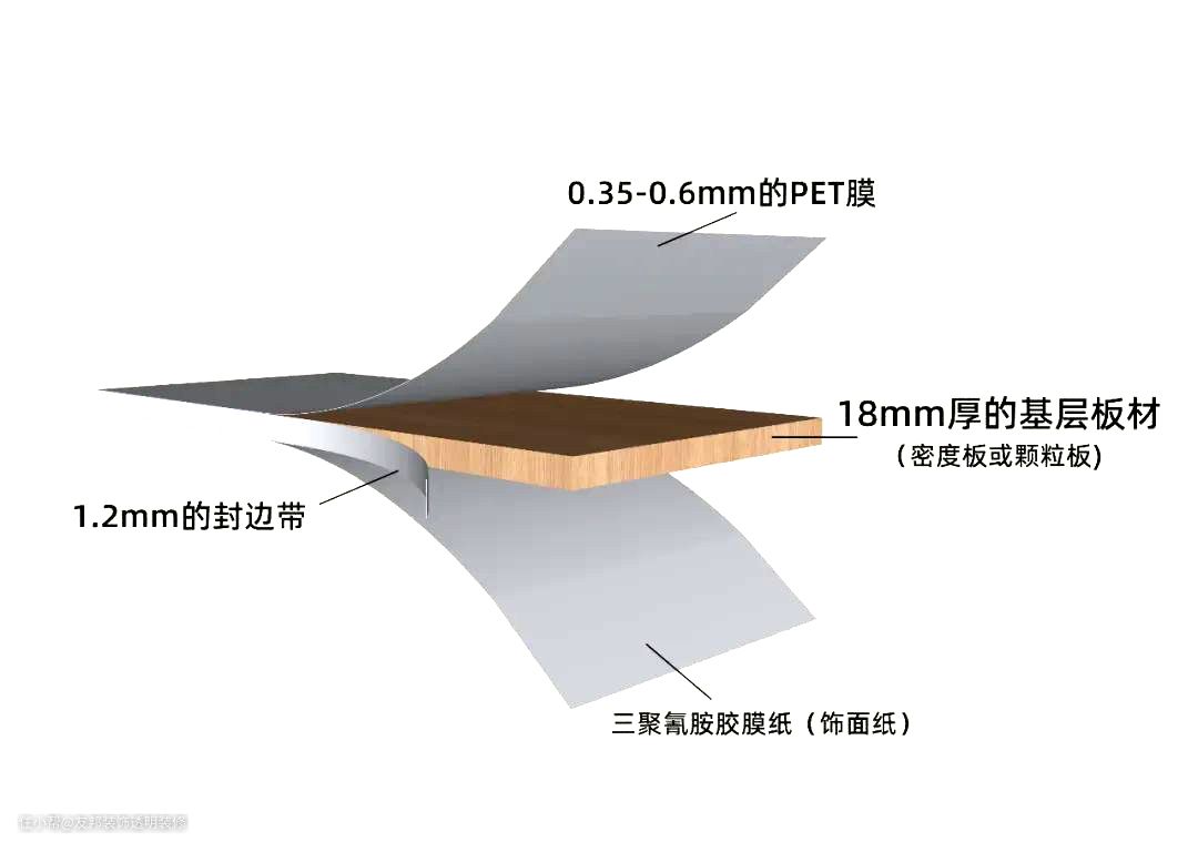 因为PET这种材料成本相对较高,所以市面上的PET板,一般采用正面是PET覆膜,背面是三聚氰胺贴纸覆膜,虽然节省了成本,但是板材两面张力不平衡,物理性能不好。