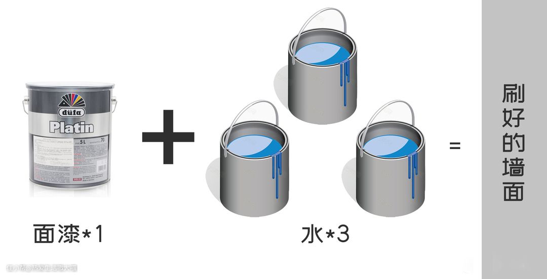 这也是大喵在文章中多次说的事情了,但还是有很多家长不在意。你们购买的乳胶漆产品描述都很棒,拥有各种功能。但是如果像装修公司那样1:3的比例兑水,也就是1份乳胶漆兑3份水,什么乳胶漆都会失去原有的效果和功能,更形成不了漆膜。切记一定要全程现场看着,在给师傅两包华子。