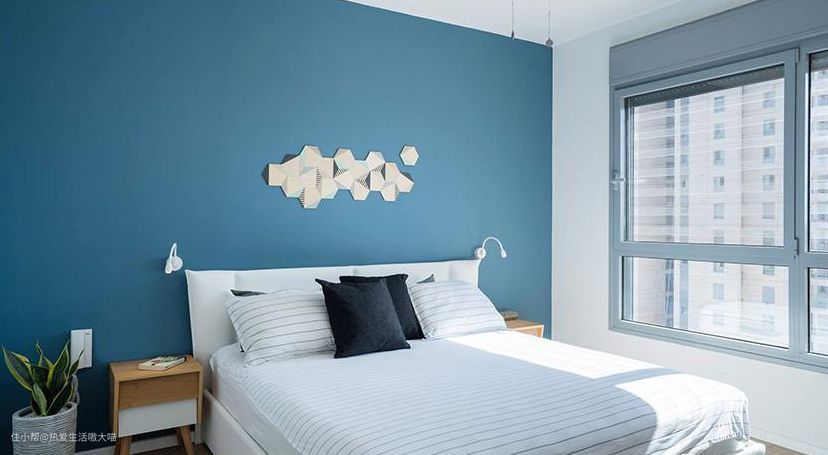 如果家人睡眠不好,可以在卧室的一面墙或者全屋选择低彩度的蓝色,具有催人入眠的作用。如果在房间选用低彩度的冷色调颜色,会使房间看起来宽敞不少,比较放松,此外房顶墙壁,地板的色调如果依次加深的话,会让人感觉房顶很高,更有立体感。