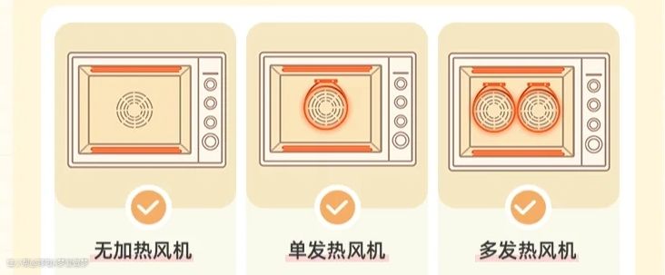 - 单发热风机:只有一个风机风机四周有发热管风炉烤箱,发热管+热风可纯热风循环加热容量较大