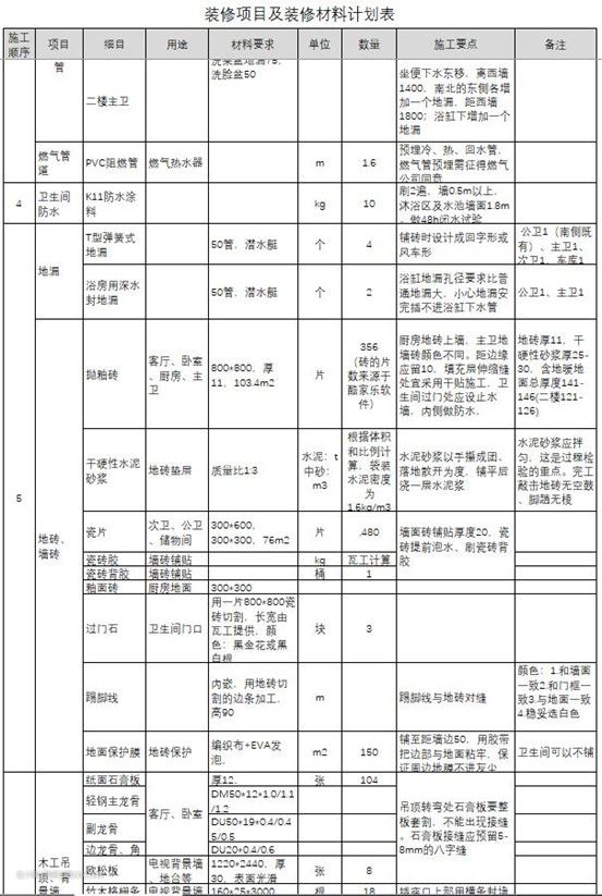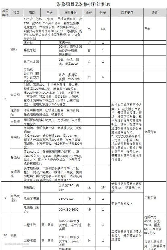 包括施工顺序、项目、用途、材料要求、数量、施工要点等内容。这张表列完,你对整个装修过程就有了系统的认知,已经能够做到心中有数,不会再感到茫无头绪。