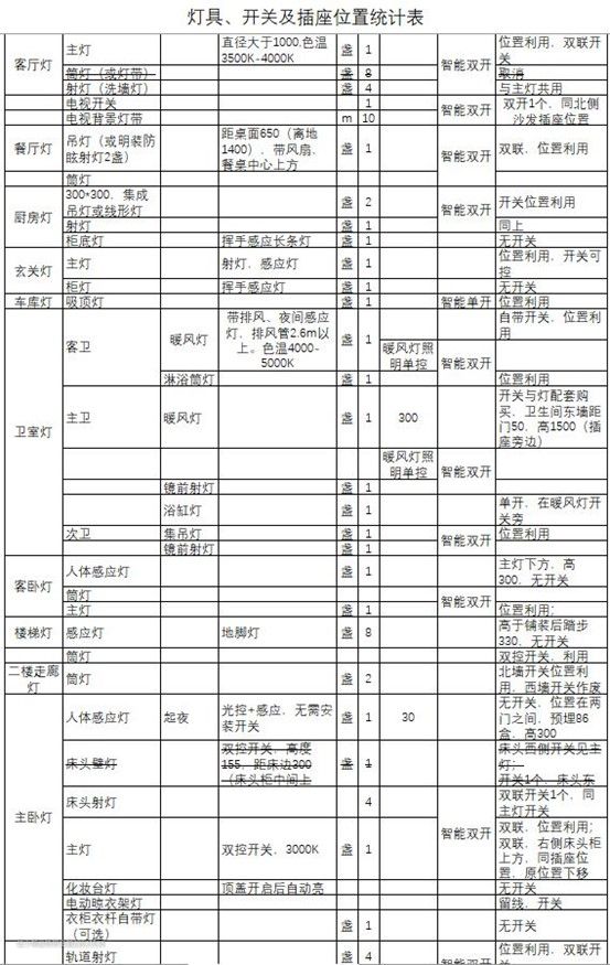 这是在设计图中边画边统计出来的,灯对应的开关都列的清清楚楚。这张表格结合上一张表格,就完全可以进行水电开槽施工了。顺便说一下:设计图中家具家电的位置和尺寸大小影响着插座的位置,必须先设计好家具家电,床、沙发、书桌等家具即使没到买的时候,也要先确定尺寸,否则插座的位置不是太远就是被挡住。装修的各个工序是环环相扣的,所以才经常踩坑,想要装修不留遗憾,就要下足功夫,最重要的还是做好计划。
