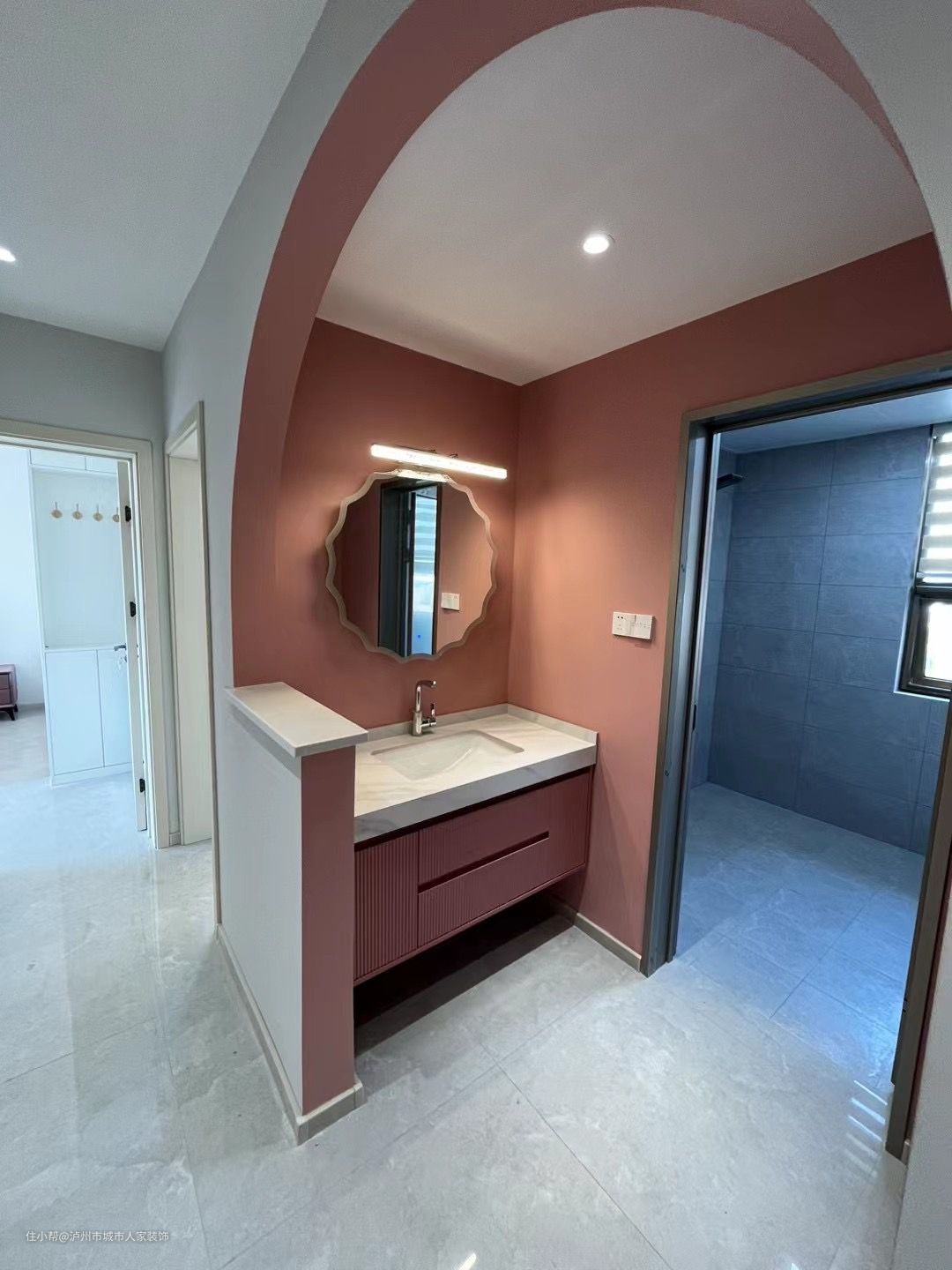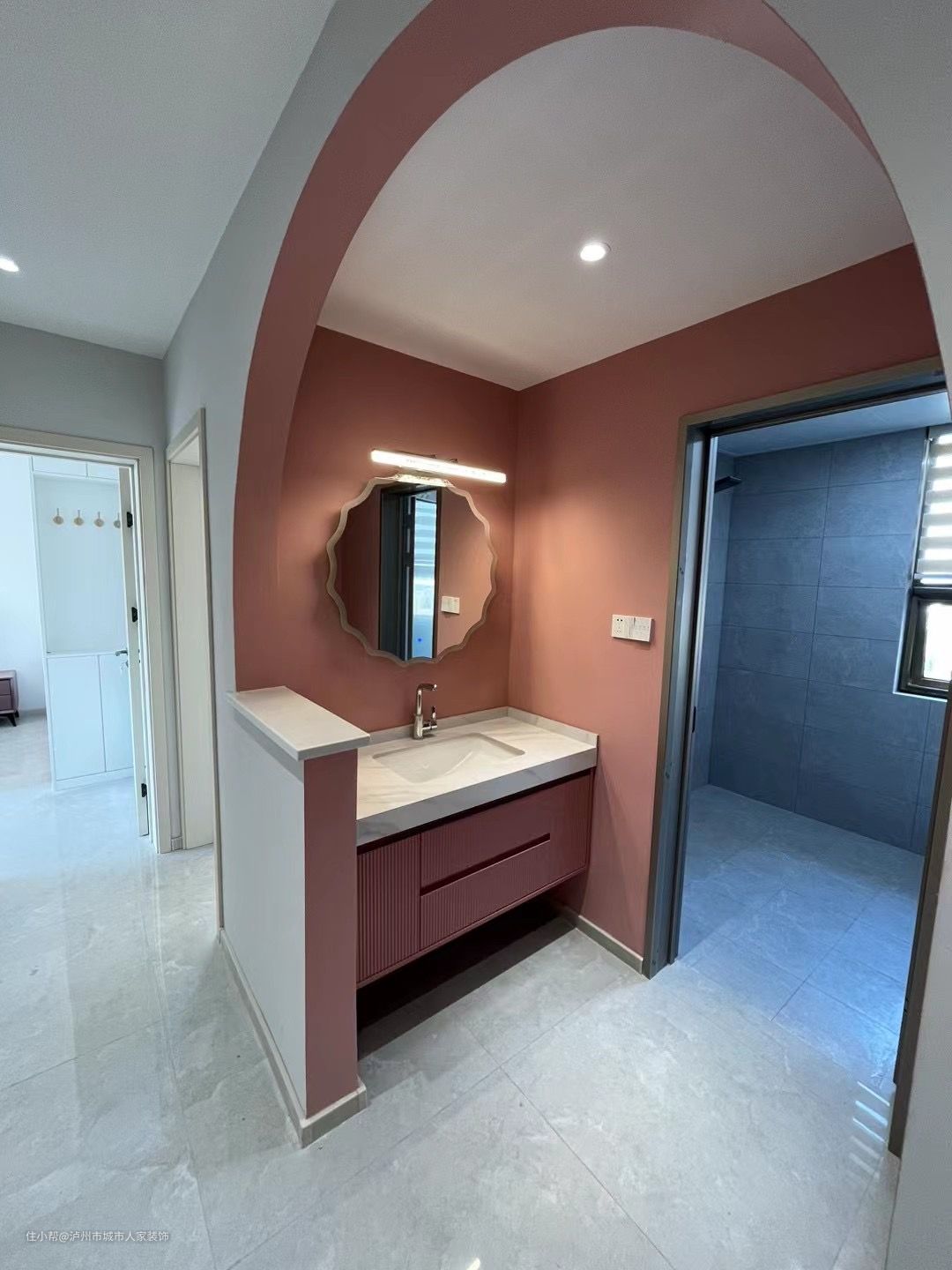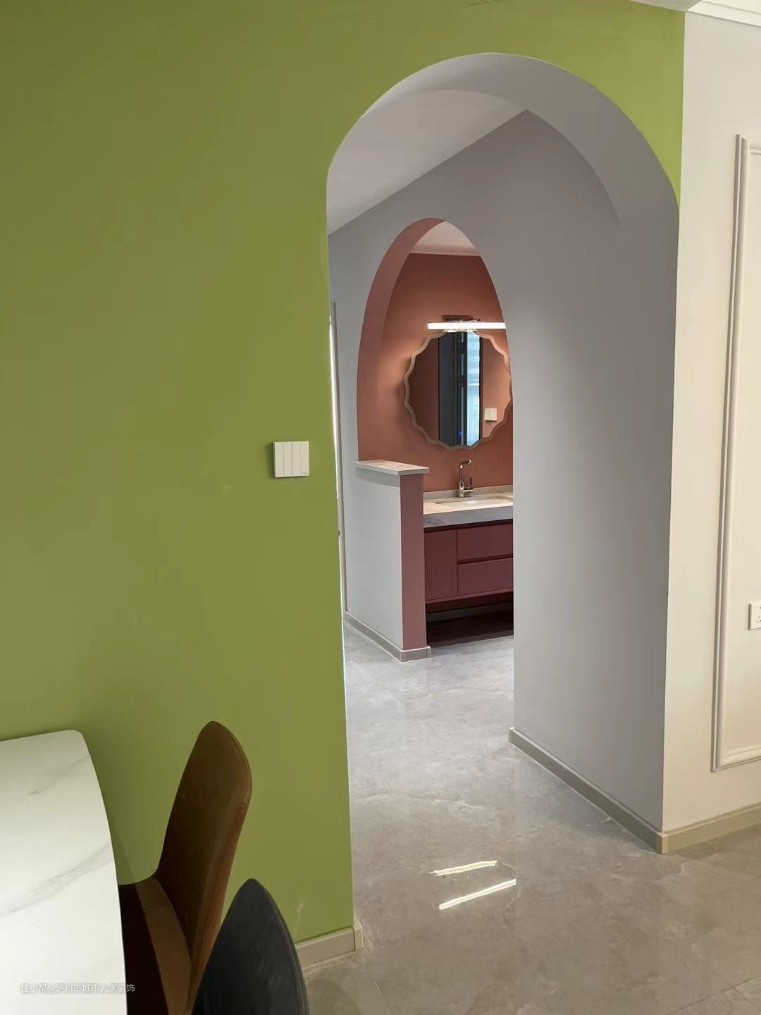 过道背景配色让人眼前一亮,撞色设计,弧形的造型门洞让空间多了些灵动。