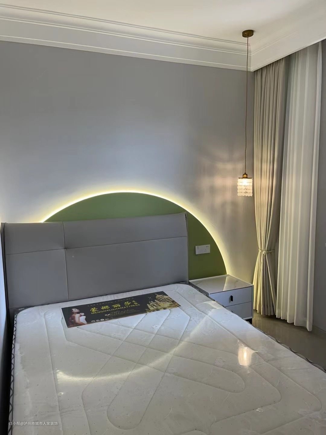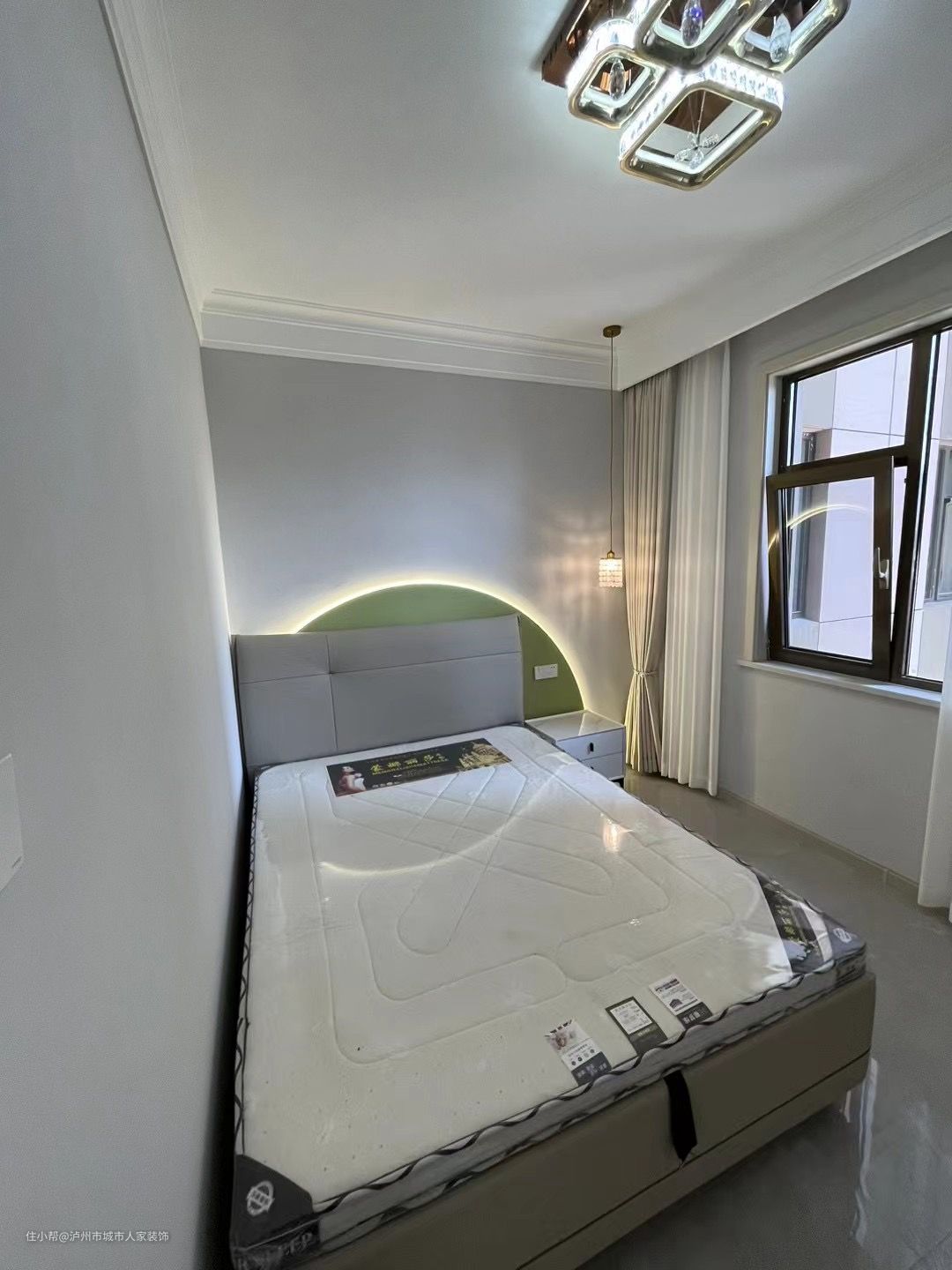 另一个房间稍小,但空间也没一处浪费,吊灯采用独特的造形,床也很大,床后面加了一块绿色的背景色,里面加装了氛围灯,搭配上床头灯,整个空间温馨更具艺术感。