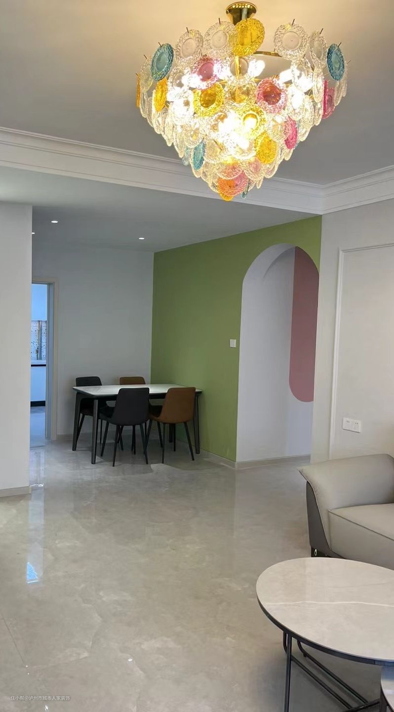 客餐厅为一体,绿白碰撞的色彩让整体色调呈现出高级的质感,客厅做了彩色的吊灯,为空间增添许多的艺术感,随着光线的变化折出不同的光影。开放式客餐厅布局,白色的桌面与其配套的椅子,绿色的背景墙面,显得自然清新,舒适的用餐环境。