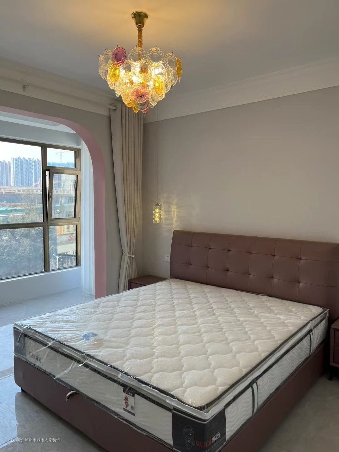 卧室延续客厅的欧式风格,做了彩色的吊灯,温柔的打在各种颜色上,既温馨又舒适。两侧床头柜视觉上更加轻盈,收纳卧室小物件,宽敞的大床,看起来柔软,可以舒展一天的疲惫,一侧窗户设计成拱形,设计感丰富。