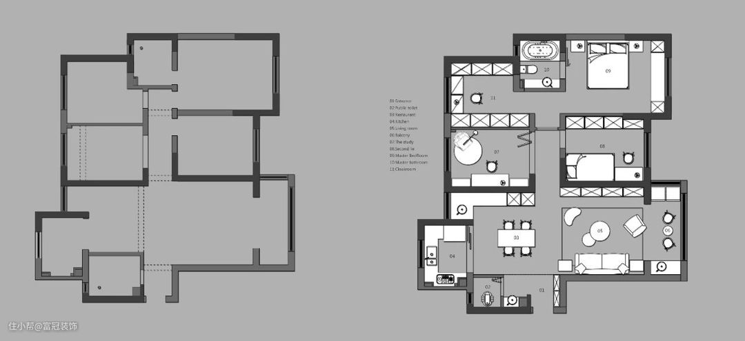 1、原过道和卫生间采光、宽敞度不够,利用玻璃材质,增加空间的通透感和视觉穿透力。