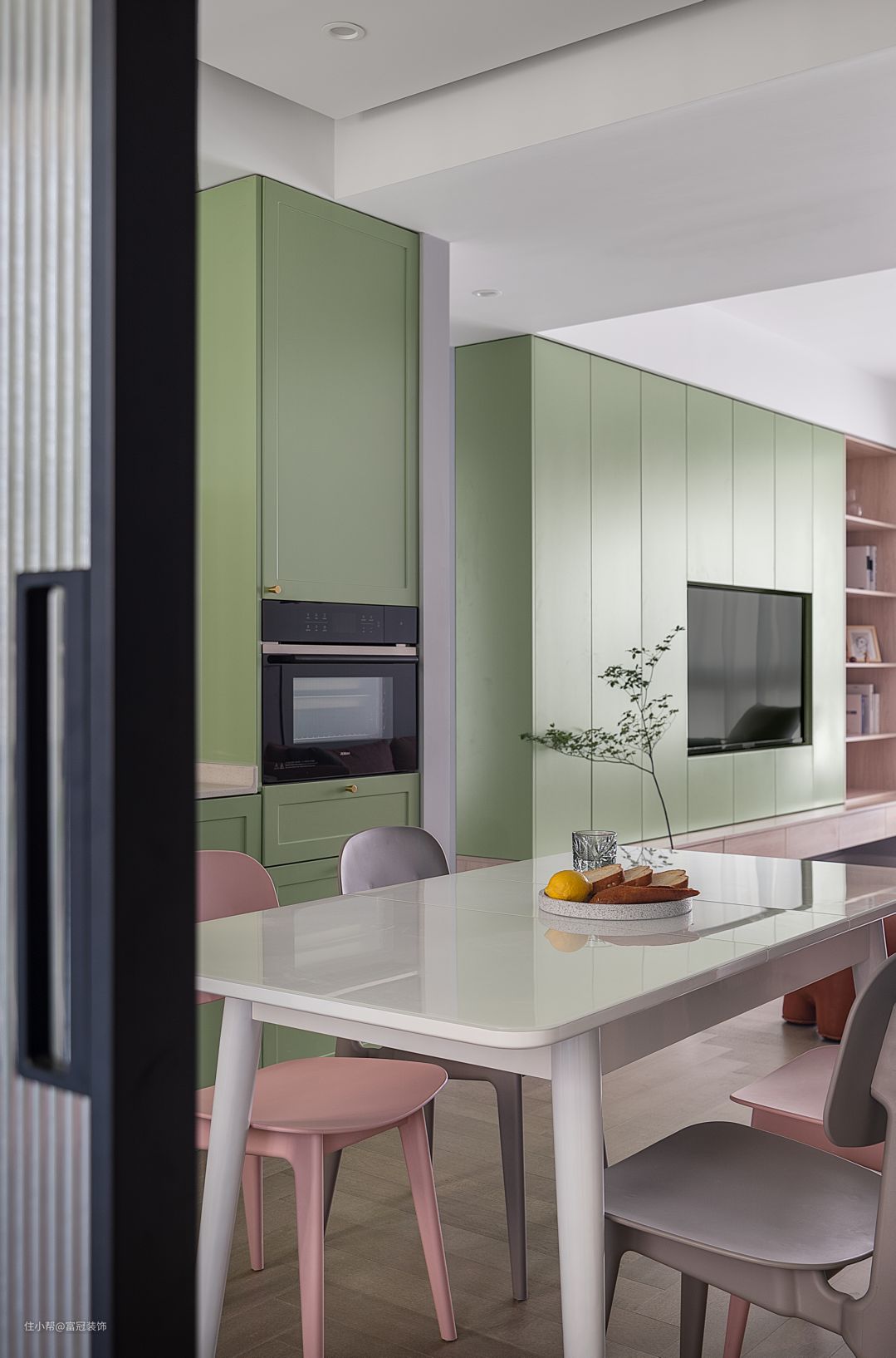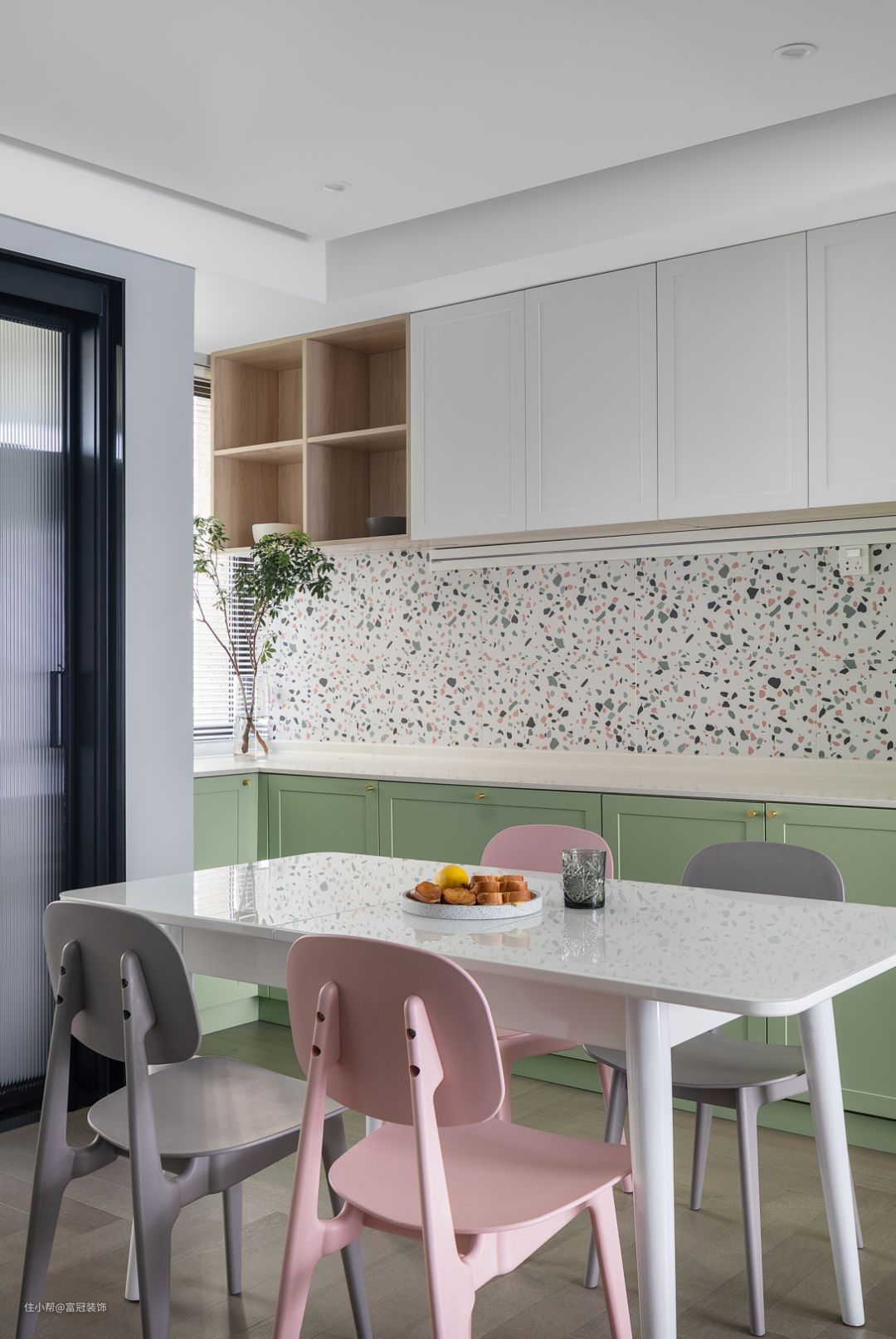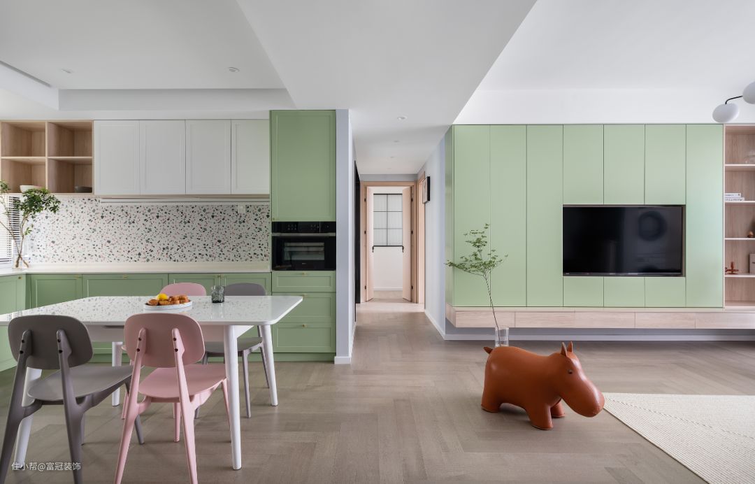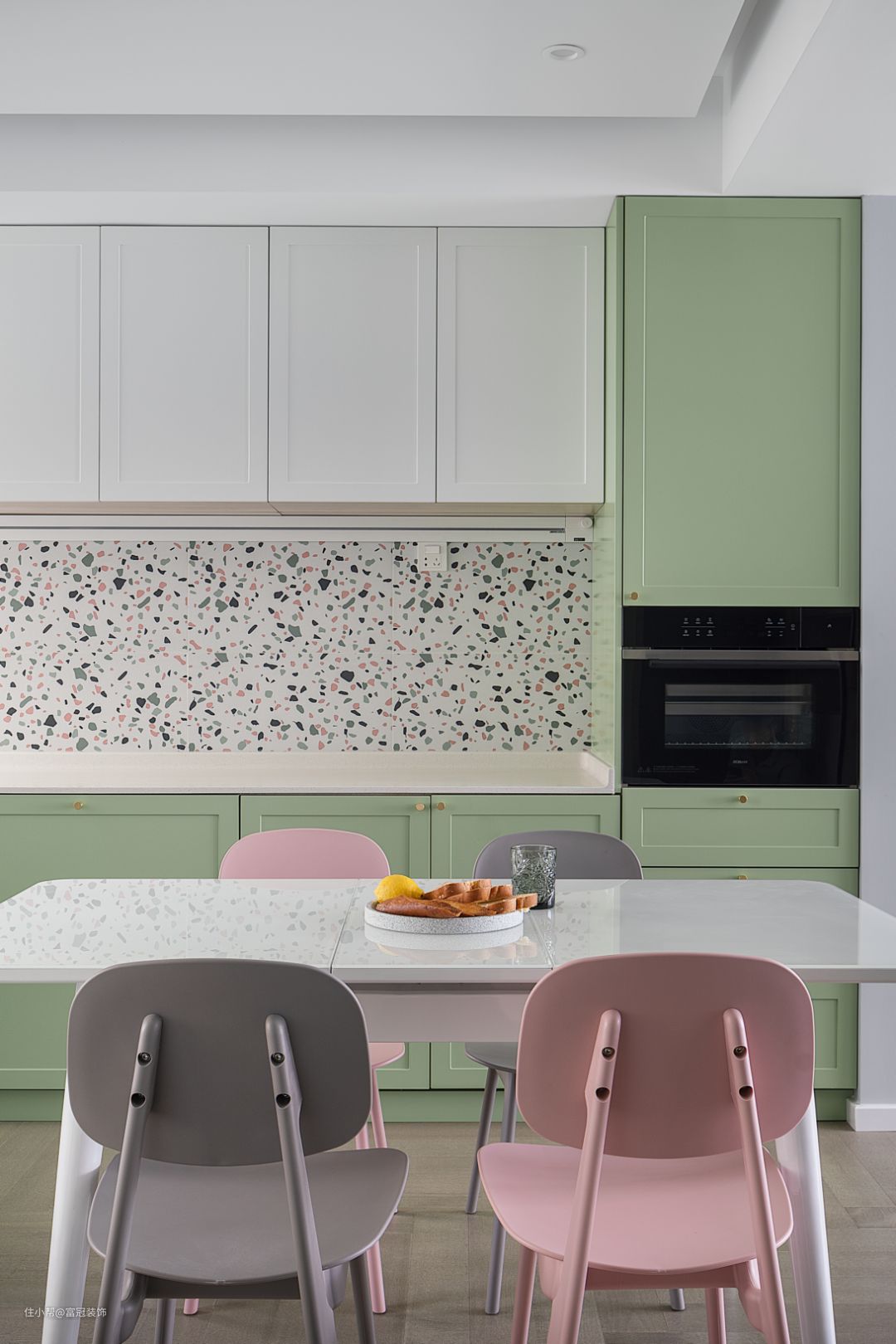 蒸汽炉的尺寸事先确认并嵌入机柜中。鳄梨绿+水磨石元素的CP组合碰撞出无限的视觉惊喜,营造出明亮欢快的用餐氛围。