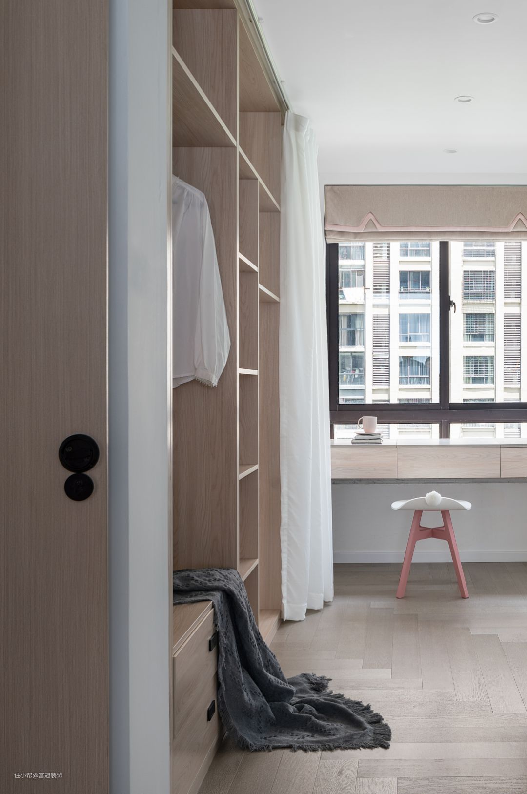 衣帽间使用了窗帘和定制的存储系统,一眼就能轻松穿戴。拉起窗帘可以避免灰尘。