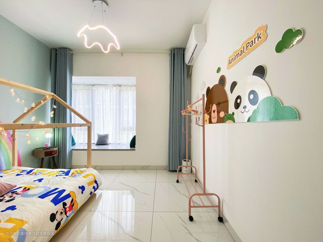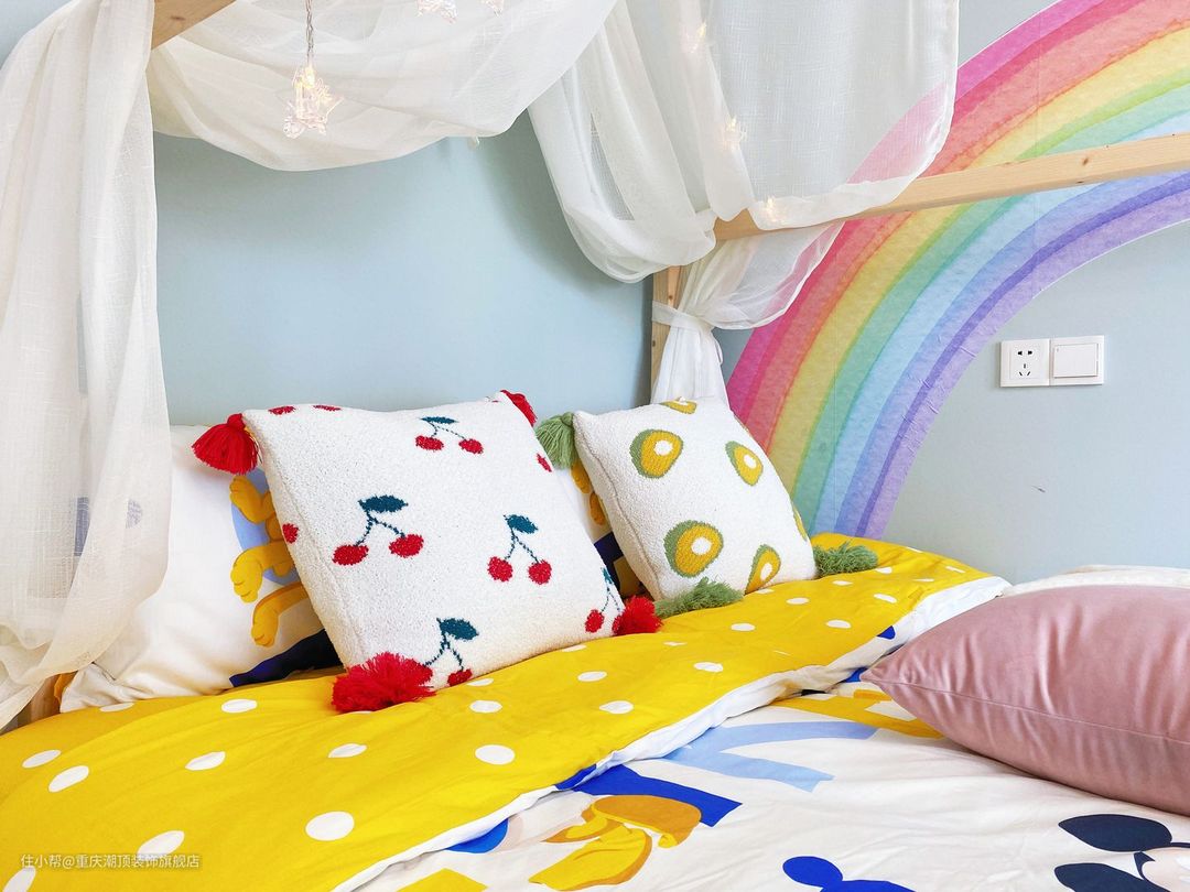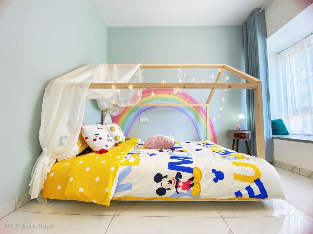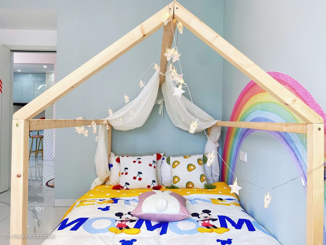 具有梦幻色彩的当然属儿童房了,小时候总有一个过家家的梦,在这里能满足所有孩童的梦想,对比客厅的高饱和色彩,儿童房选用莫兰迪浅蓝色为背景乳胶漆,搭配童心彩虹装饰和帐篷造型,仿佛通话世界。