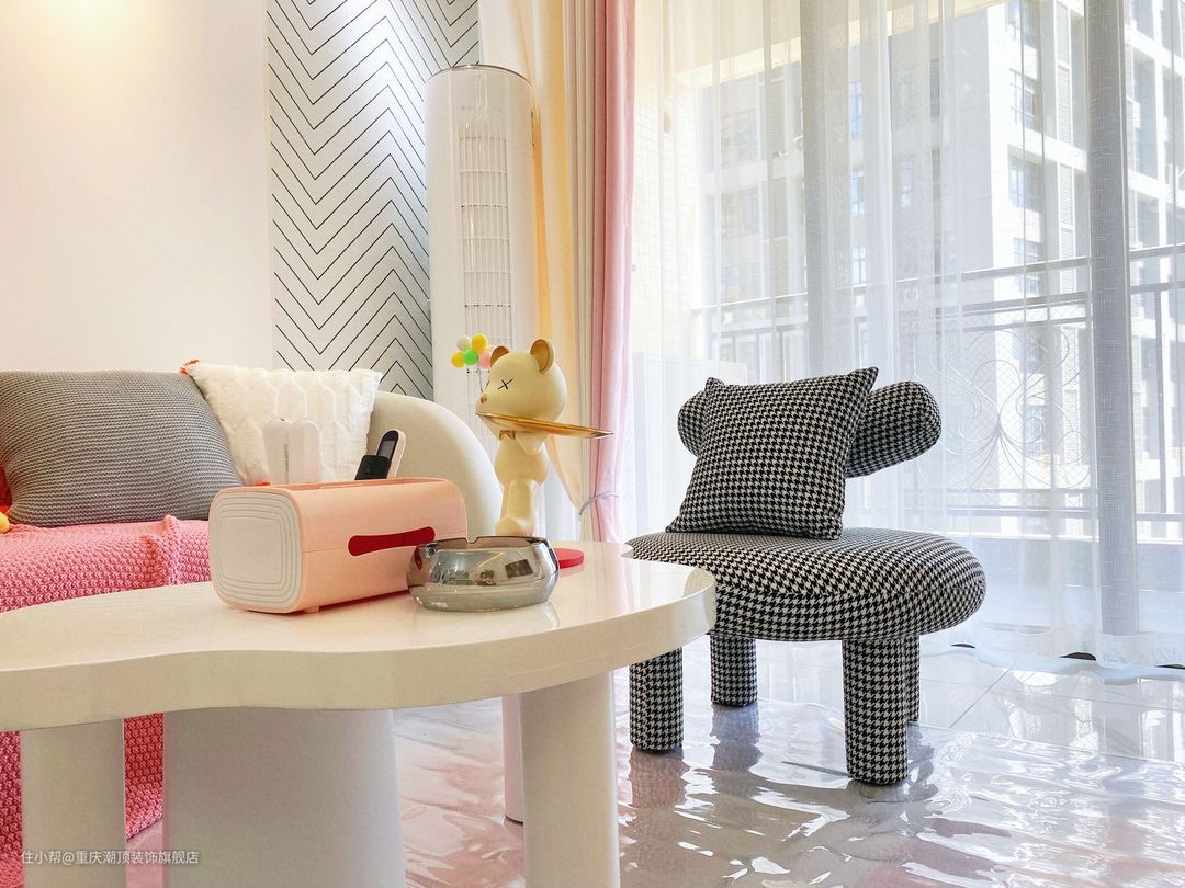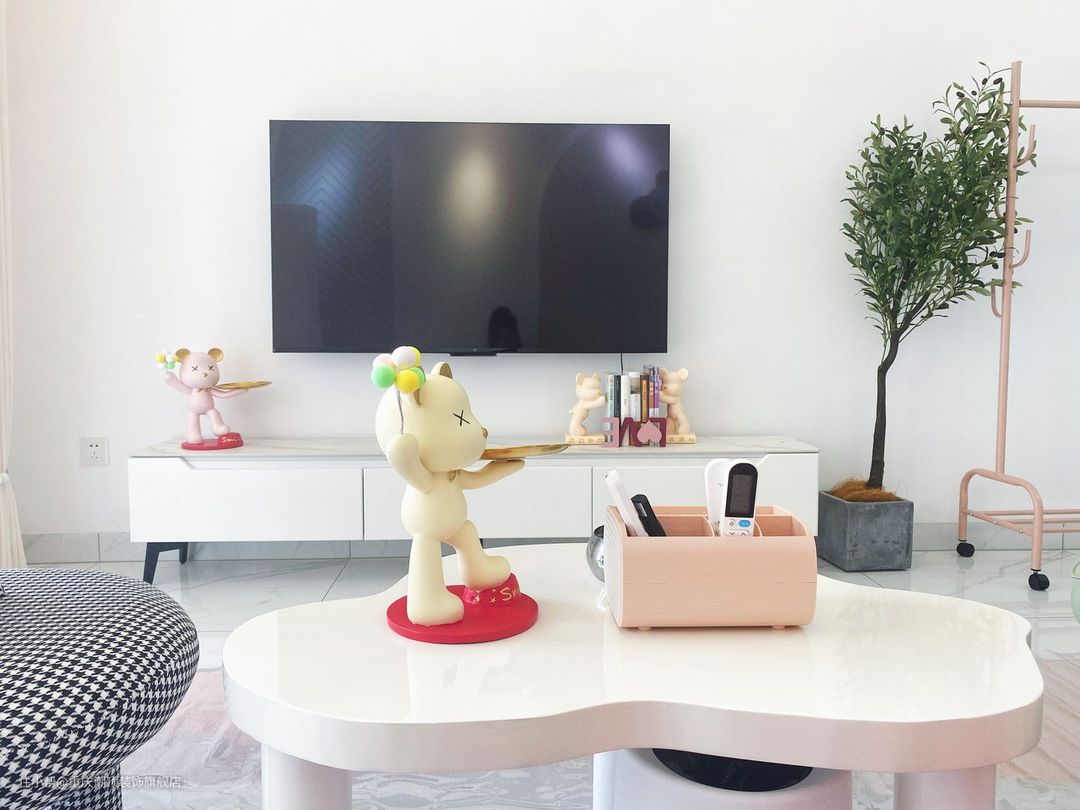 软装方面,高低圆桌、奶白色的小沙发很醒目,上面放着圆圆的斑马抱枕。 这样的客厅含糖量也太高了吧! 电视墙没做多余的造型下方做一字型悬浮电视柜。 旁边搭配移动式多功能架子。搭配绿色系盆栽,为整个空间增加生动气息