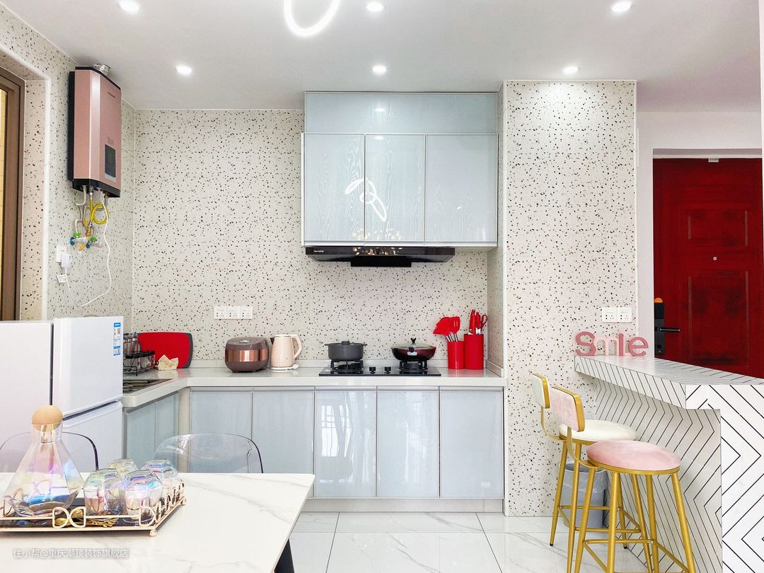 进厨房门做拱形门造型设计,转角处做了一个“心机”小吧台设计,在厨房外部做了个传菜口,这样在最近的距离吃上最热乎的菜,厨房背景做波西米亚瓷砖,搭配浅色橱柜,相对于客厅的姹紫嫣红,厨房显得低调许多