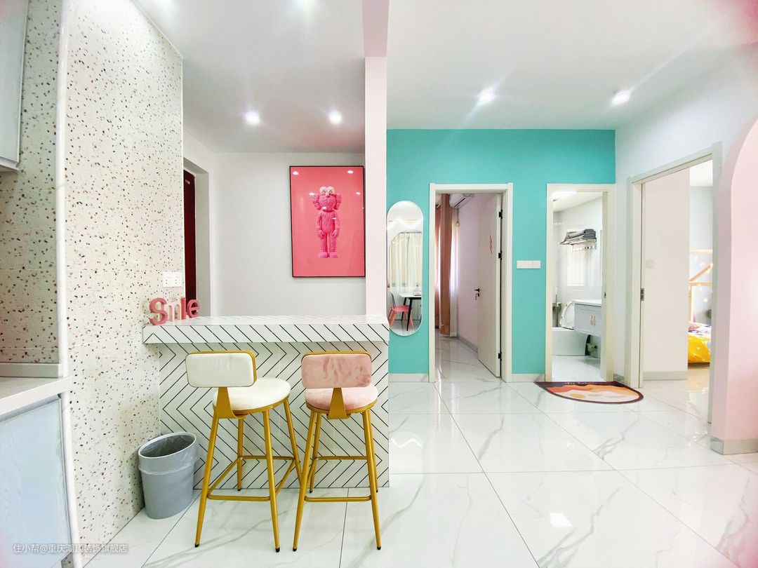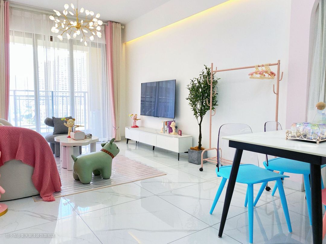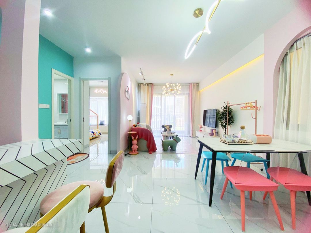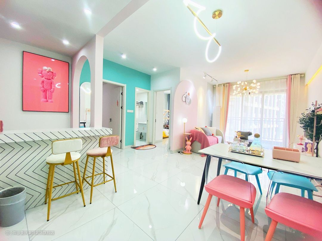 用餐区,长方形的西餐桌搭配粉色系和湖蓝系凳子,与客厅整体的背景色彩相辅相成。 晚上吃饭的时候,打开少女感十足的白色荔枝吊灯,调到让人更有食欲的暖光,瞬间明白好装修的意义。