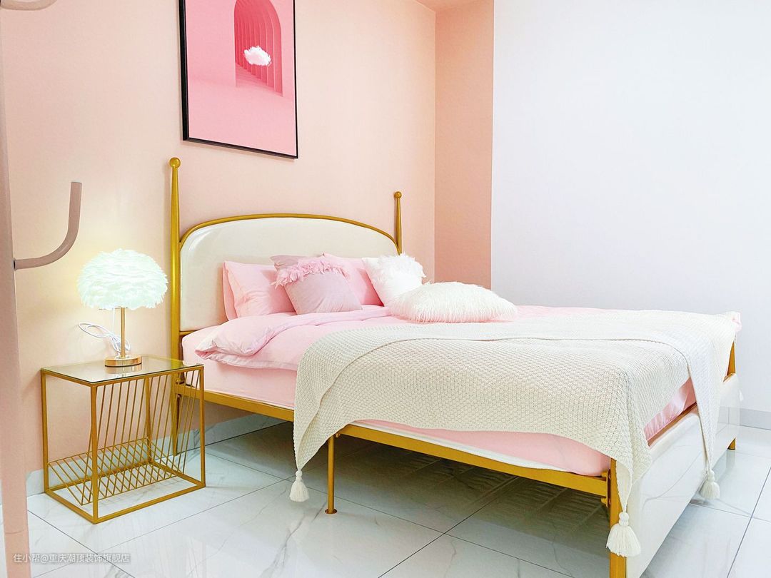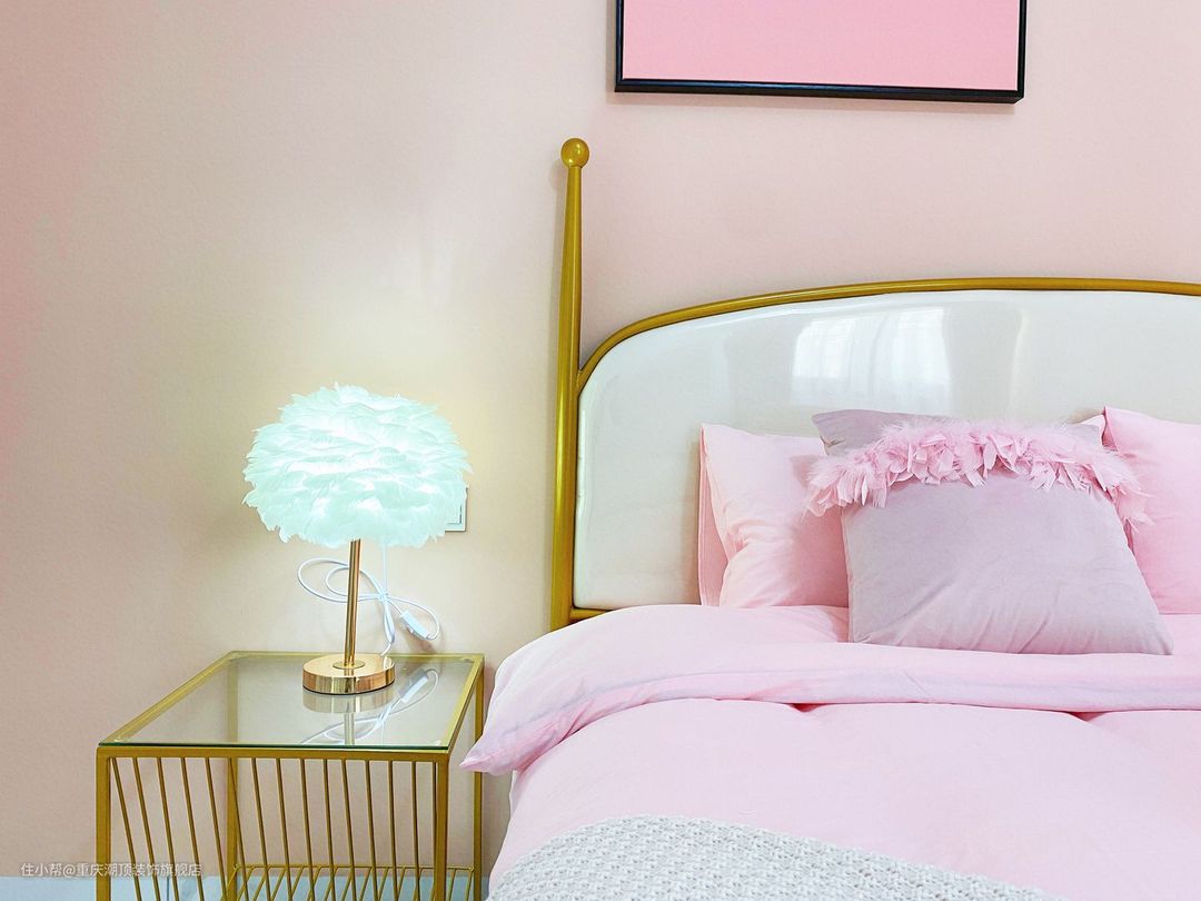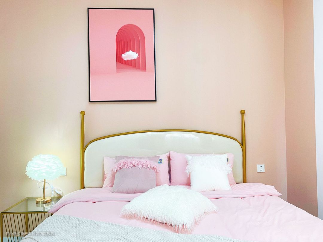 卧室整体是少女十足。 床头背景墙和沙发背景墙层次感搭配,淡橘色背景搭配粉色系挂画,公主羽毛台灯。除了淡橘色就是白色墙面一直延伸到顶部,简约高级 15米高靠背欧式软垫大床与公主同款,桃粉色纯色四件套,搭配床边轻奢床头柜,让整个空间更加丰富温馨。