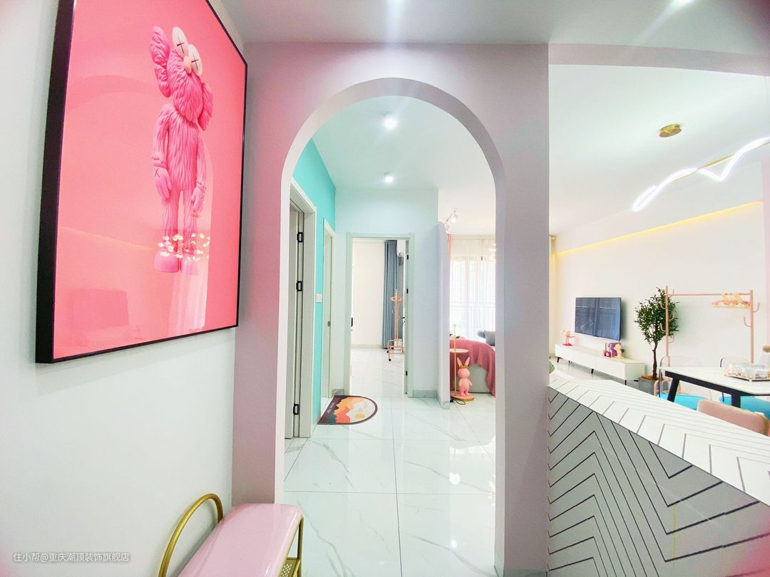 客厅和餐厅的一体化设计,上面铺着汉白玉瓷砖,显得更加宽敞明亮。 沙发背景墙采用低饱和色彩乳胶漆,简约轻奢风花卉吊灯,充满北欧风情。 还有一个比较出彩的设计,那就是背景墙湖蓝色墙漆和粉色系相称整体看起来,甜而不腻,让整个空间更加丰富。