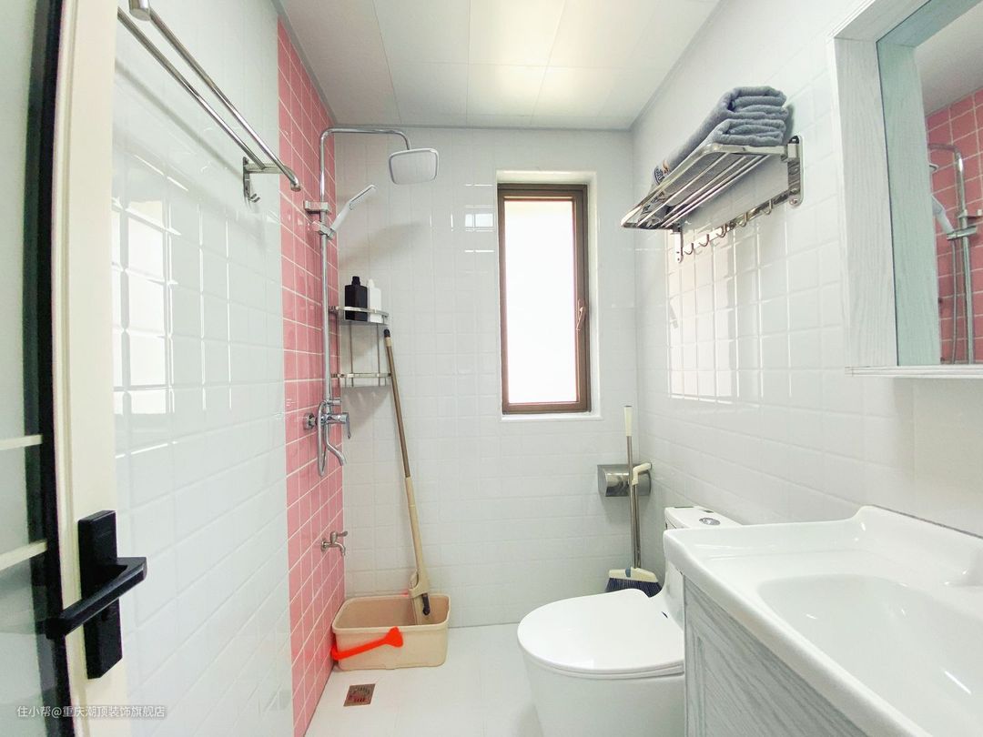 干区部分,藕粉色浴室背景墙,搭配白色洗手池,都是饱和度比较低的颜色,甜美又百搭、纯白浴室柜,简单又高级。仙女的日常不过如此啦