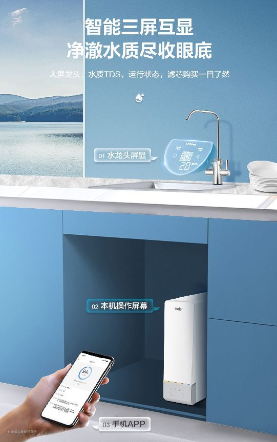 以上,简单做个总结:这款海尔鲜活水净水器HRO10H11-2U1外观简洁大方,机身纤薄,不占用过多空间。通过双芯五星精滤、RO+鲜活水2.0技术让过滤净水效果更好,让大家喝到干净、安全的水、净水器自带双出水龙头,分别提供纯水和净水,全家直饮、煮饭煲汤、淘米洗菜都非常方便。龙头屏、机身屏、手机屏,三屏智控,水质及滤芯寿命全时可见,每一滴水都安全放心。也非常贴心,非常值得购买。
