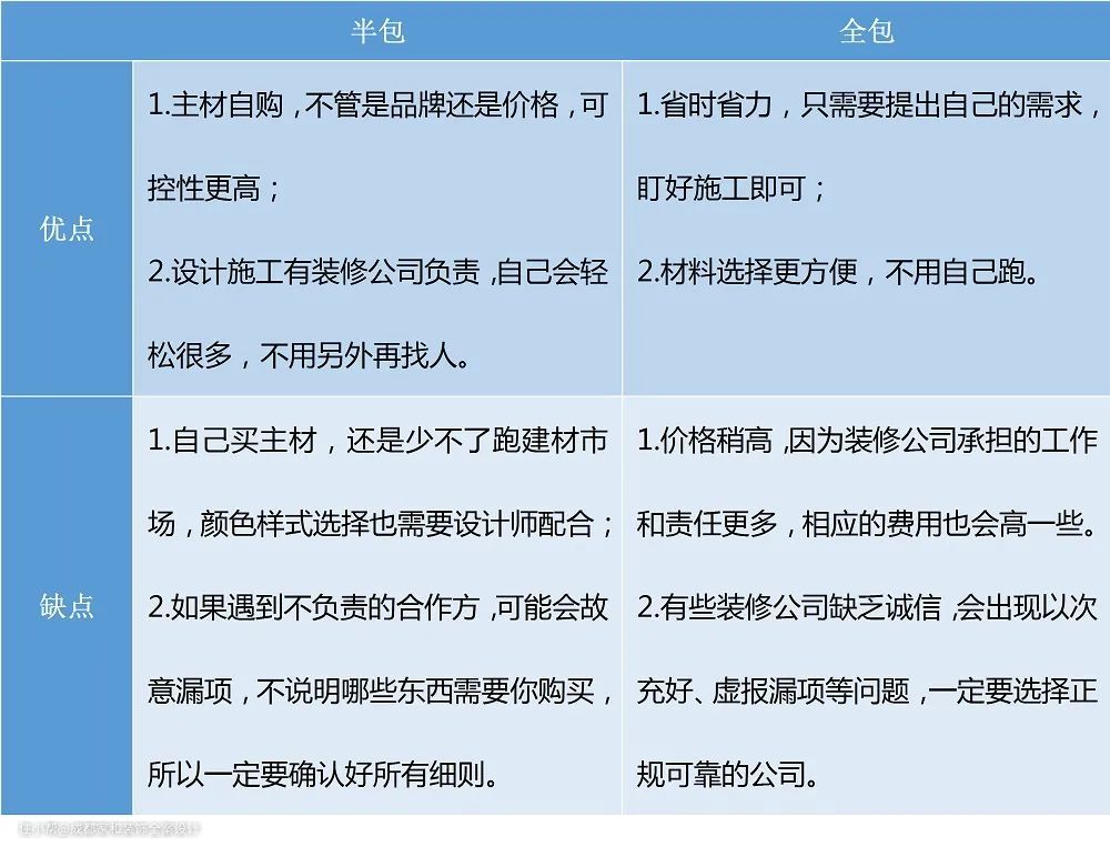 全包:全包则是指装修设计、辅料、主材、施工都由装修公司负责,业主只需要购买家具家电软装即可,适合平时比较忙、不想太麻烦的朋友。