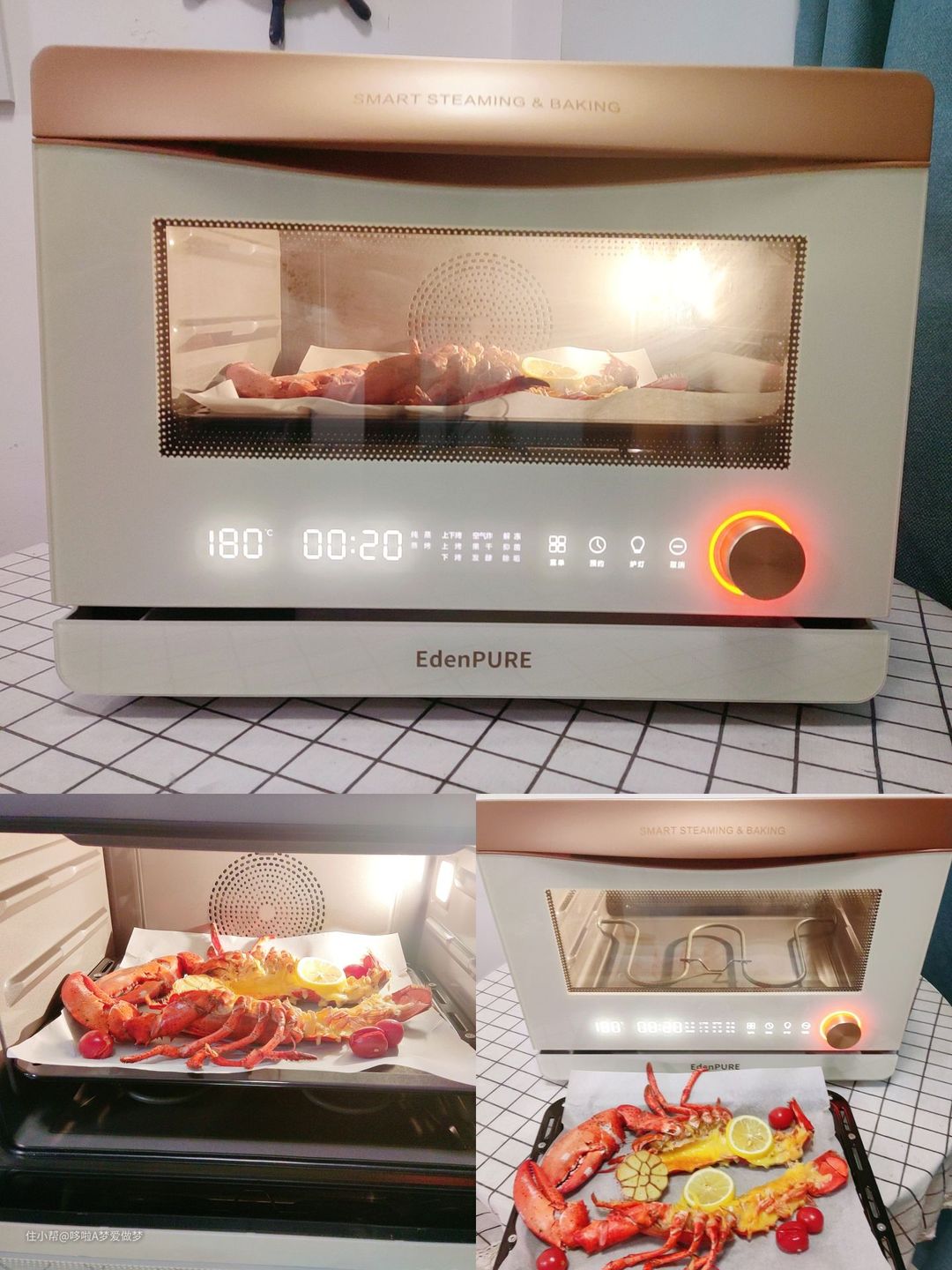 用纯烤模式做了一道芝士焗龙虾,模式选好之后屏幕显示180°C,20分钟,按一下旋钮,就开始烤了,保留了鲜味和水分,做出来的龙虾肉鲜嫩多汁,上色均匀,整只龙虾都熟透了,之前用家里的纯烤箱也做过这一道菜,也是180°C,但烤熟至少需要25分钟,而宜盾普EDC-ZK26只需要20分钟,加热更快、更均匀,省心省力又好吃。