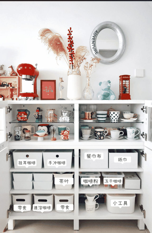 🍠博主Apple_bobi家的餐边柜,则是带玻璃门的海丝塔储物组合,白色简洁优雅,好看的酒杯、餐具、酒放在里面,既能装饰空间,还能取悦自己。