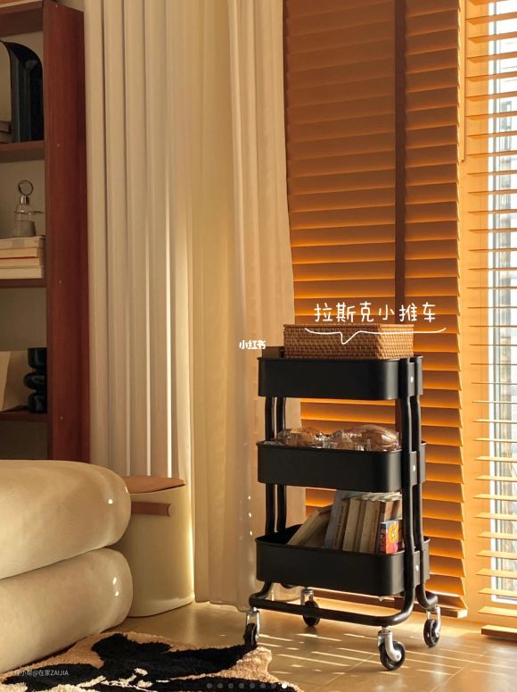 拉斯克小推车也“参与”到了展示型收纳中,是杂物框、是零食车、也是临时小书架,推到哪都毫无违和感,是收纳空间的有效补充。
