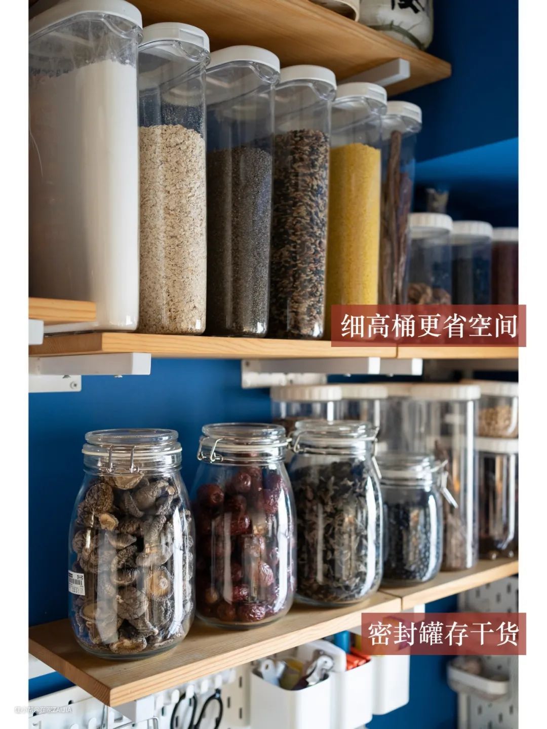 她把宽度1米,高度2米的空间,分为了上中下三段,上面的隔板,用新购置的宜家365+储物罐、考肯储物罐,放进各种干货。