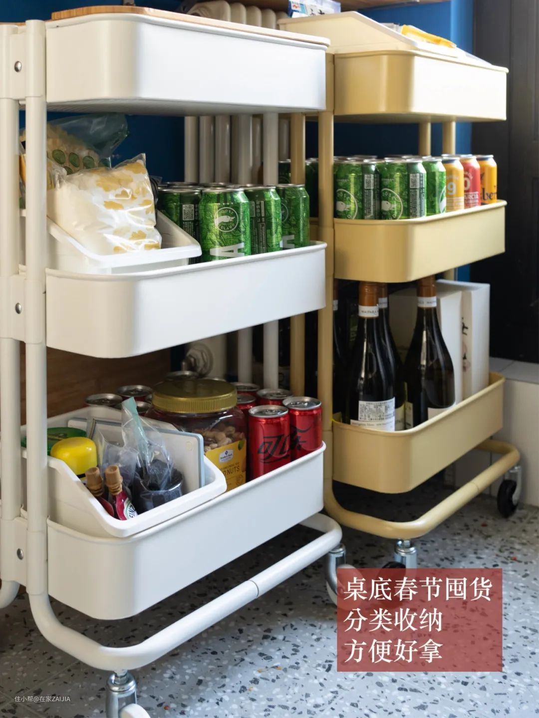 调料盒、菜板、刀具这些随手物品,都放在台面的收纳架上。把常用食材、饮料、小工具放进小推车,随时备用,台面整洁不显乱。