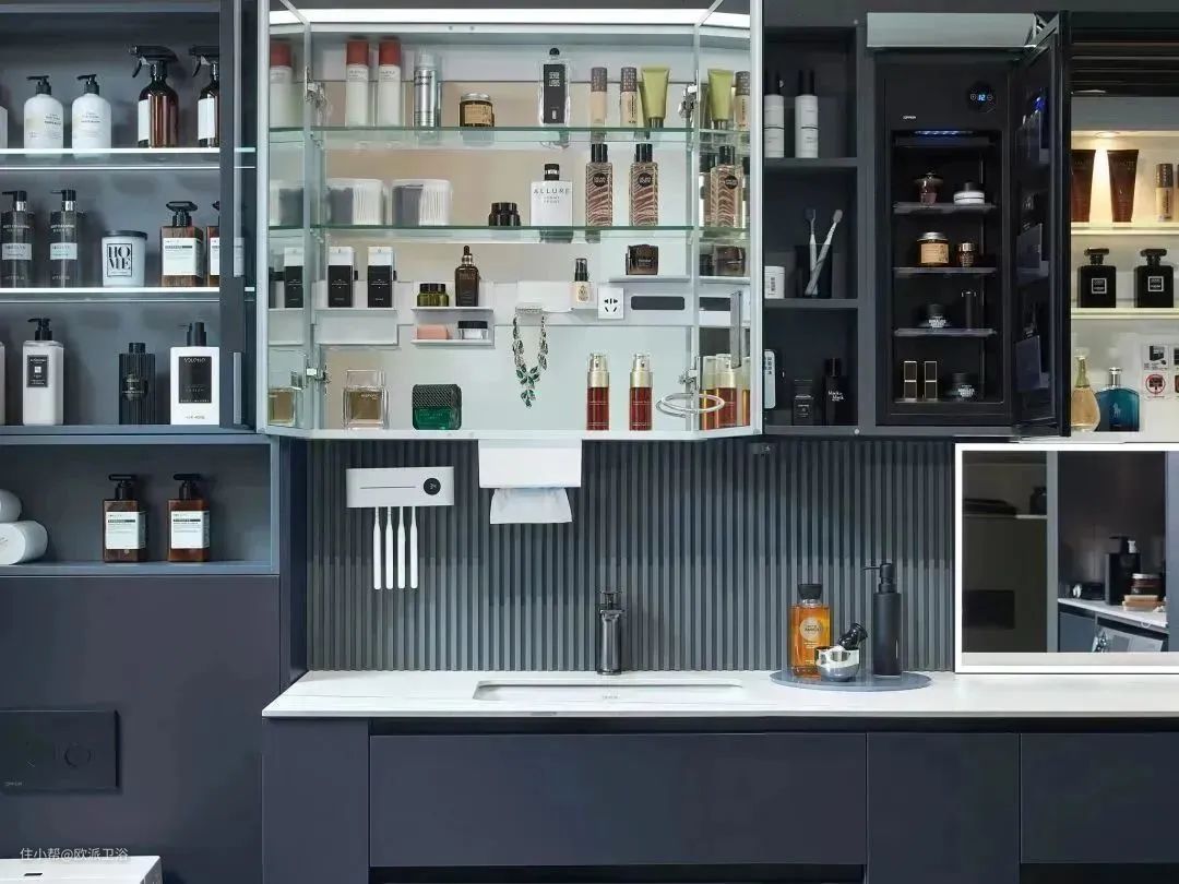 多功能镜柜极大地拓展了收纳空间,实用功能强大,是小户型卫生间的绝配,比如欧派卫浴科纳的折叠移动镜柜,一边不影响镜子,一边解决储物烦恼,自带超大收纳空间,全家的洗漱用品放进里面都不是问题。