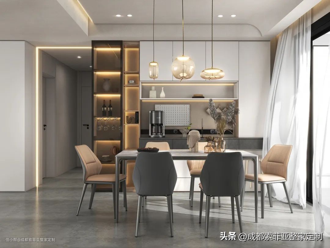 餐厅定制了赫本系列的餐边柜,珍珠白搭配木色,玻璃搭配木质,平滑流畅的线条美感,1.8m的赫本餐桌椅,边角处做了弧角处理,弱化了灰色的冰冷感,也避免了日常的磕碰。造型不一的圆形吊灯散发着暖色的光源,为就餐提供了舒适的氛围。